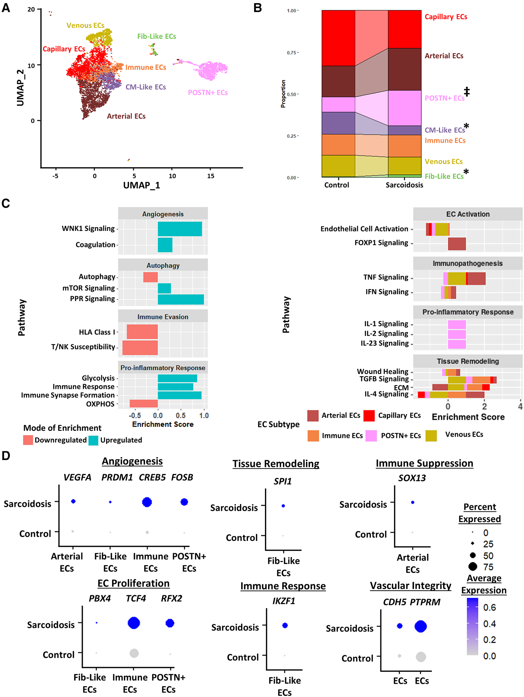 (A) UMAP clustering of subclustered endothelial cell subpopulations by cell type. The following fibroblast subpopulations were identified: capillary endothelial cells (ECs), arterial ECs, POSTN+ CM-like ECs, immune ECs, venous ECs and Fib-like ECs. (B) Proportion analysis of each identified cardiac endothelial cell cluster across disease status. Statistically significant changes with a p-value <0.05 are indicated by a (*) while statistically trending changes with a p-value <0.1 are indicated by (‡). (C) Supervised gene-set enrichment results in cardiac endothelial subpopulations showing pathways shown to be significantly enriched in sarcoidosis relative to control. Pathways shown to be significantly enriched in all endothelial cell clusters are shown on the left while subpopulation-specific patterns are shown on the right. Positive enrichment scores indicate pathways shown to be significantly upregulated while negative enrichment scores indicate otherwise. (D) Dot plots stratified showing the expression of sarcoidosis-specific transcription factors (TFs) in the cardiac datasets in control and sarcoidosis endothelial cell subpopulations. Average gene expression was scaled from 0 to 0.6. The classification group of each TF is shown colored above its respective gene expression plot.