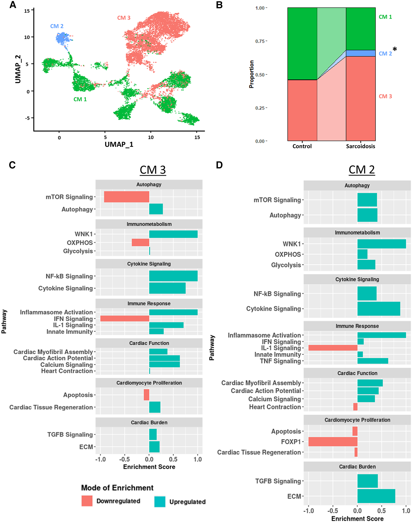 (A) UMAP clustering of subclustered cardiomyocyte subpopulations by cell type. Three distinct cardiomyocyte subclusters were identified termed: CM 1, CM 2 and CM 3. (B) Proportion analysis of each identified cardiomyocyte subcluster across disease status. Statistically significant changes with a p-value <0.05 are indicated by a (*). (C) Supervised gene-set enrichment results in cluster CM 3 showing pathways shown to be significantly enriched in CM 3 relative to CM 1 and CM 2. Positive enrichment scores indicate pathways shown to be significantly upregulated while negative enrichment scores indicate otherwise. (D) Supervised gene-set enrichment results in cluster CM 2 showing pathways shown to be significantly enriched in CM 2 relative to CM 1 and CM 3. Positive enrichment scores indicate pathways shown to be significantly upregulated while negative enrichment scores indicate otherwise.