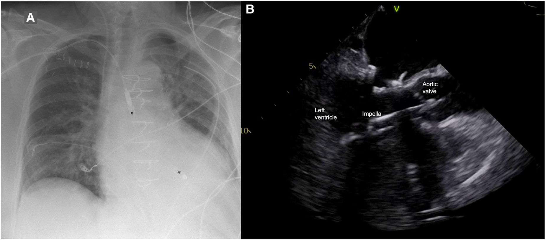 (A) Postoperative chest x-ray with Impella 5.5 pump (X outflow, ✽ inflow); (B) Impella position in transesophageal echocardiography.