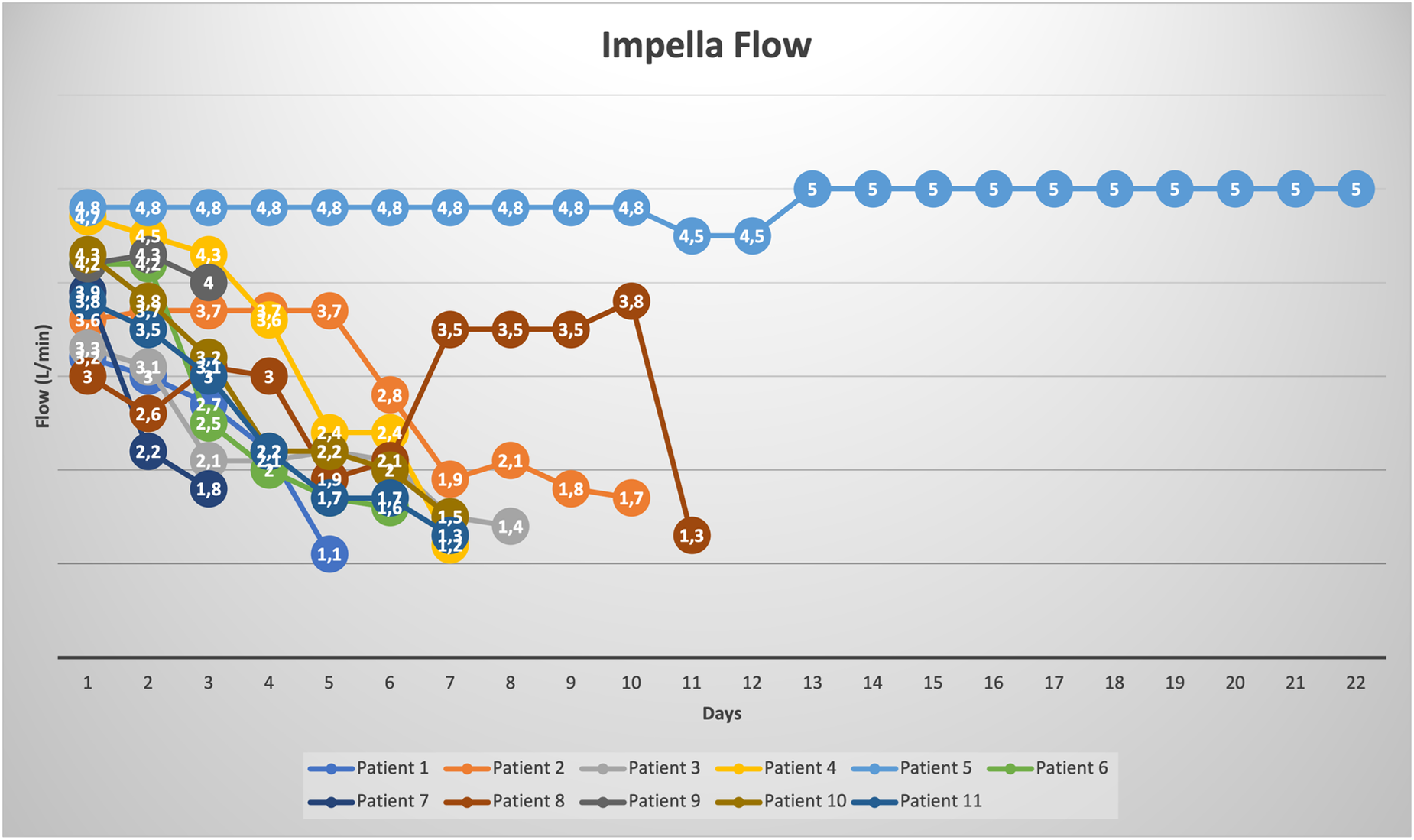 The Impella related data is demonstrated in Table 3. Mean duration of Impella support was 8 ± 5 days (Figure 2). 10/11 patients were weaned from Impella support. In one patient, with preoperative LVEF of 5%–10%, Impella weaning was not achieved. No device related complications occurred, in particular no cerebrovascular accident, vascular complications, no aortic valve injury and no thrombosis, exchange or dislocation of the pump. All, but one patient, were mobilized to different degrees of physical therapy while on Impella support. All patients received initial catecholaminergic support. Four patients (36.4%) were treated with a calcium sensitizer (Levosimendan®) over 24 h prior to weaning.