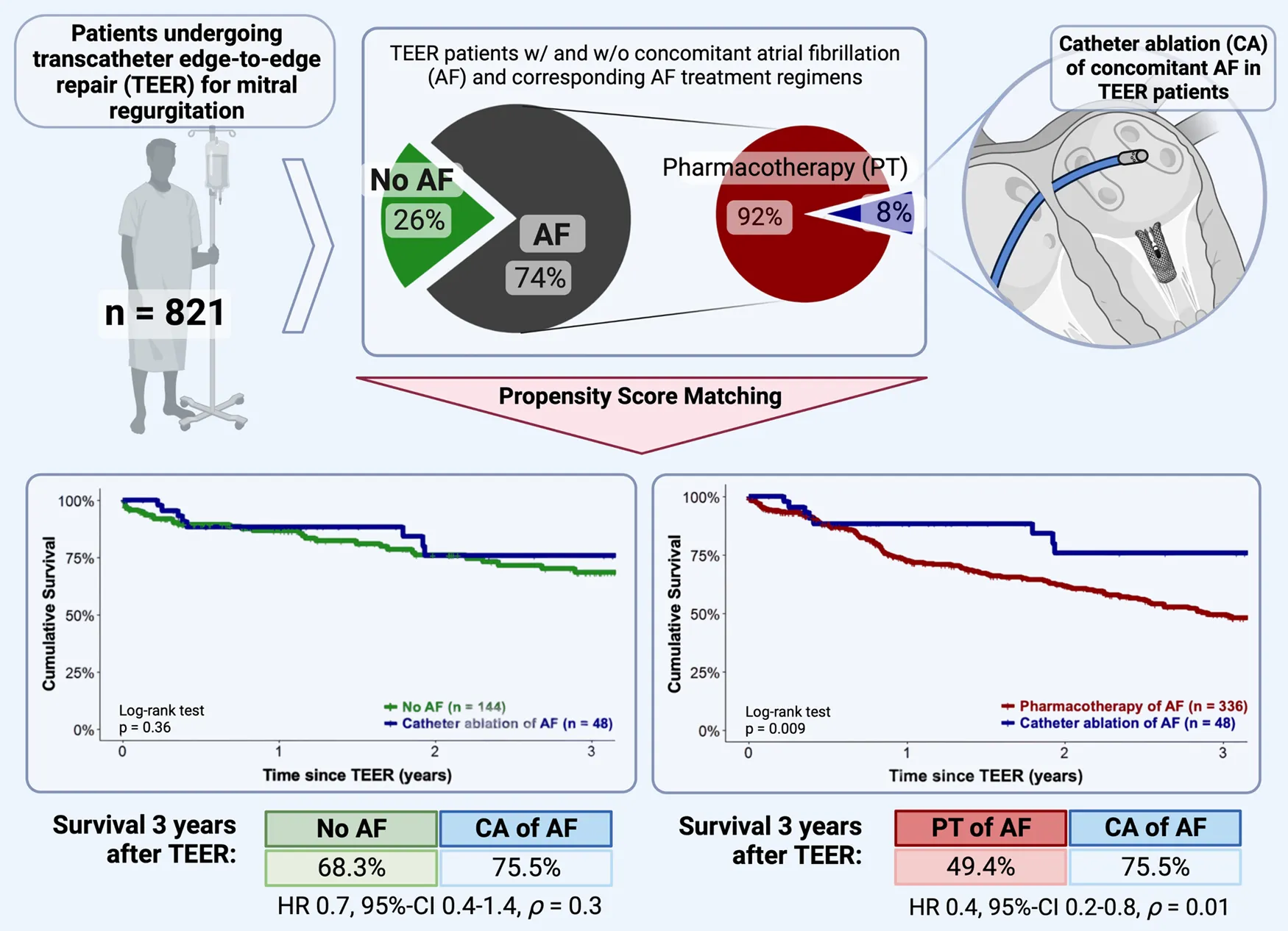 A total of 821 patients were analyzed. Of these, 608 (74.1%) had concomitant AF, of whom 48 patients received CA. Patients with CA in AF showed significantly higher 3-year-survival after TEER compared to PSM-patients on pharmacological AF treatment (75.5% [36/48] vs. 49.4% [166/336], p = 0.009). The 3-year-survival after TEER of patients with concomitant AF treated with CA was not significantly different from PSM-patients without AF (75.5% [36/48] vs. 68.3% [98/144], p = 0.36).