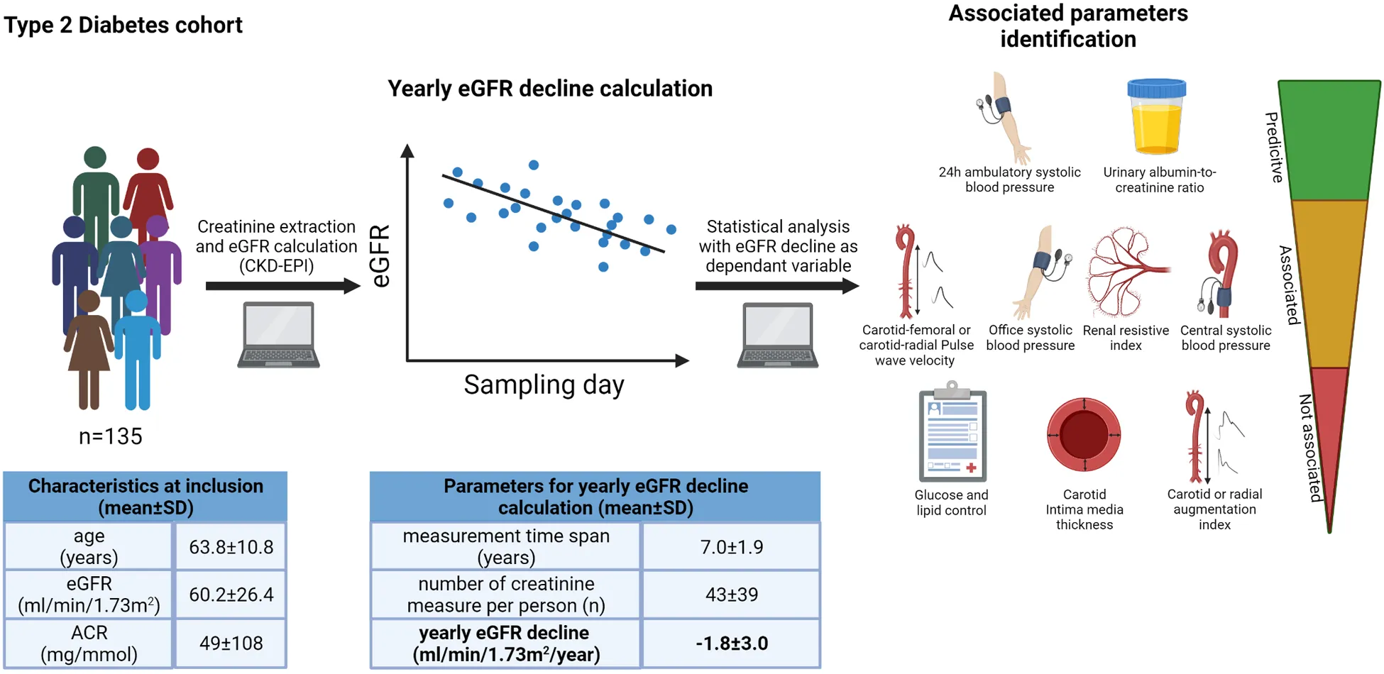 Diabetic kidney disease (DKD) affects 30%–40% of diabetic patients and is the main cause of end-stage kidney disease (ESKD) in developed countries (1). The rate of decline of renal function is highly heterogeneous (2). Classical biomarkers such as albuminuria are associated with adverse renal outcomes, but more than 30% of DKD patients do not have albuminuria and still progress to ESKD (3). Finding new biomarkers is crucial for the early identification of those at highest risk of accelerated renal function decline.