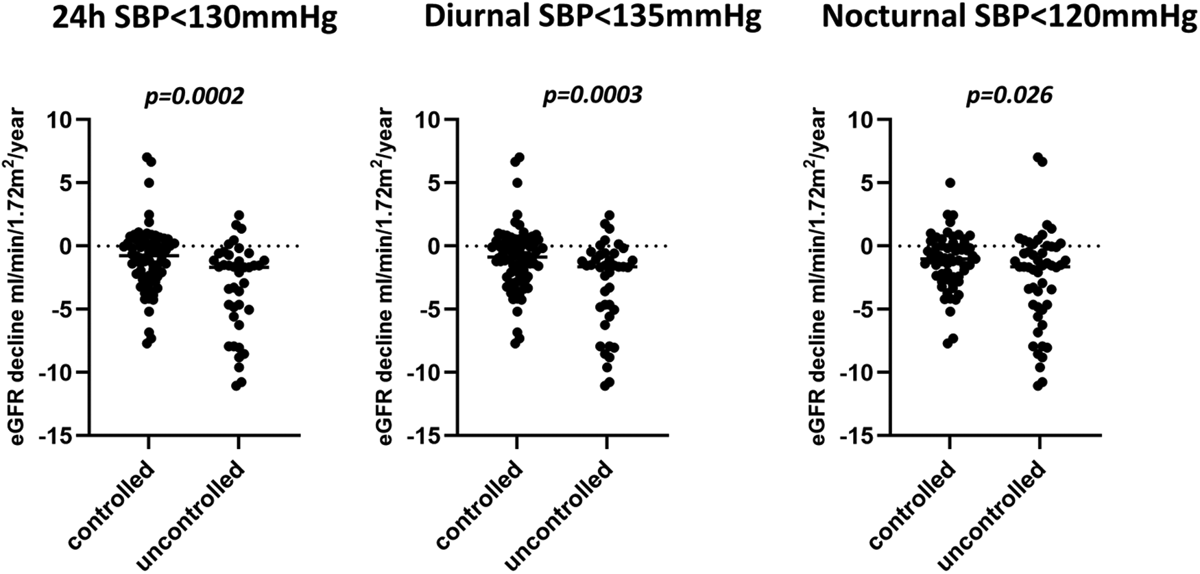 In total, 135 patients were included. Mean age was 63.8 ± 10.8y, baseline eGFR 60.2 ± 26.4 ml/min/1.73 m2 and urine albumin-creatinine ratio (ACR) 49 ± 108 mg/mmol. Mean eGFR-d was based on 43 ± 39 creatinine values within a time span of 7.0 ± 1.9y. The average yearly eGFR decline was −1.8 ± 3.0 ml/min/1.73 m2 ranging from −5.8 ± 2.3 in the first quartile to +1.4 ± 1.7 in the fourth quartile. Mean 24 h systolic (SBP) and diastolic (DBP) blood pressure were 126 ± 17 and 74 ± 9 mmHg. Mean PWV was 11.8 ± 2.8 m/s, RRI 0.76 ± 0.07 and IMT 0.77 ± 0.21 mm. SBP and pulse pressure correlated with eGFR-d but not DBP. 24 h SBP stood out as a stronger predictor of eGFR-d than office or central SBP. PWV and RRI correlated with eGFR decline in univariate, but not multivariate regression models including 24 SBP and ACR.