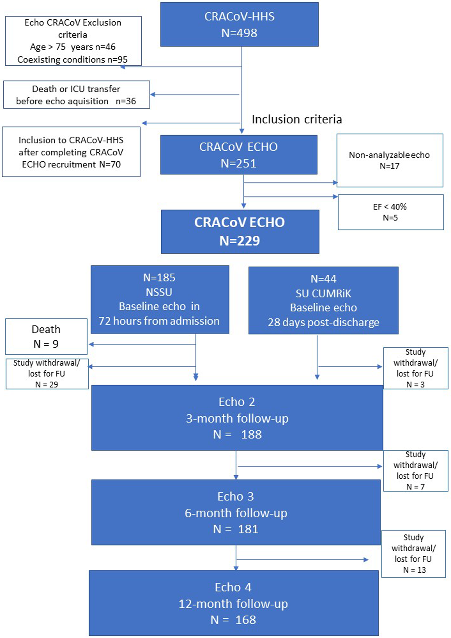 It is a well-known fact that COVID-19 affects the cardiovascular system by exacerbating heart failure in patients with preexisting conditions. However, there is a poor insight into the cardiovascular involvement and sequelae in patients without preexisting conditions. The aim of the study is to analyse the influence of COVID-19 on cardiac performance in patients without prior history of structural heart disease. The study is part of the CRACoV project, which includes a prospective design and a 12-month follow-up period.
