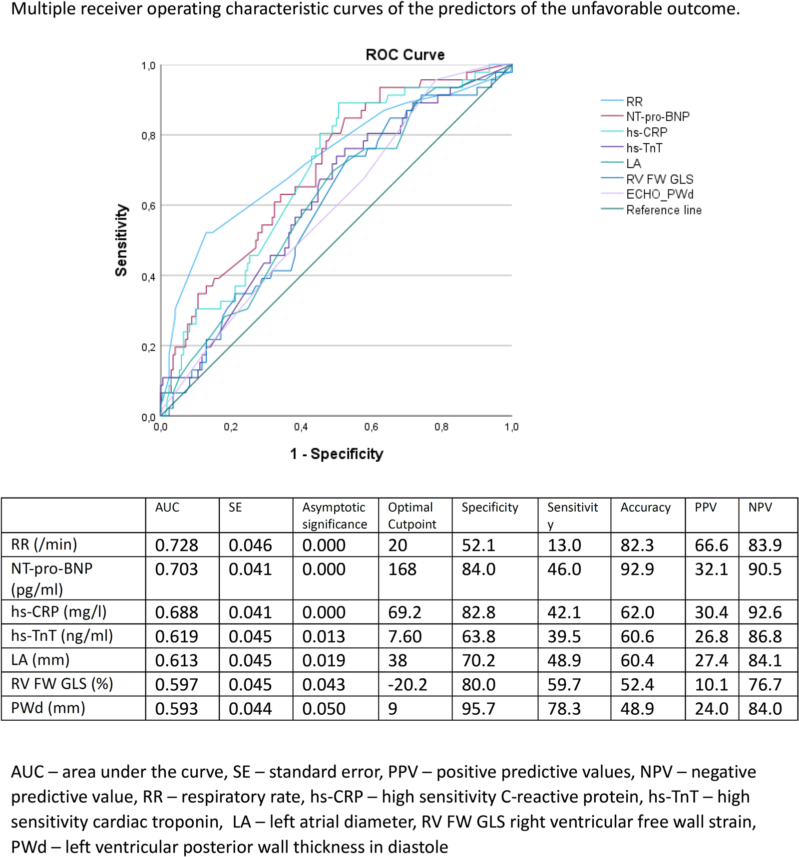 A multiple logistic regression was used to evaluate the risk factors associated with unfavourable COVID-19 prognosis defined as composite end-point consisting of in-hospital death, intensive care unit admission, or respiratory failure requiring high-flow oxygen therapy. To evaluate the discriminative performance of the logistic model, the area under the receiver operating characteristic (ROC) curve was calculated, comparing the actual outcome to the outcome predicted by the model.