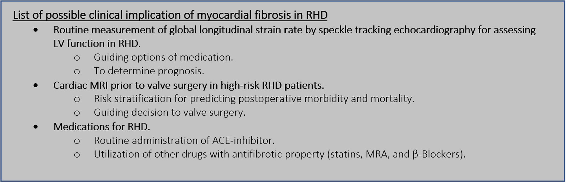 Evolving research regarding myocardial fibrosis in the field of RHD encourages clinicians to adopt a more comprehensive approach to treating RHD. Utilizing recent discoveries with significant clinical impact in our daily practice will benefit patients with RHD. Further advantages can be gained when more research for clinical benefit is conducted in this area of expertise. Future research can guide both medical and surgical programs for the patients (Figure 4).