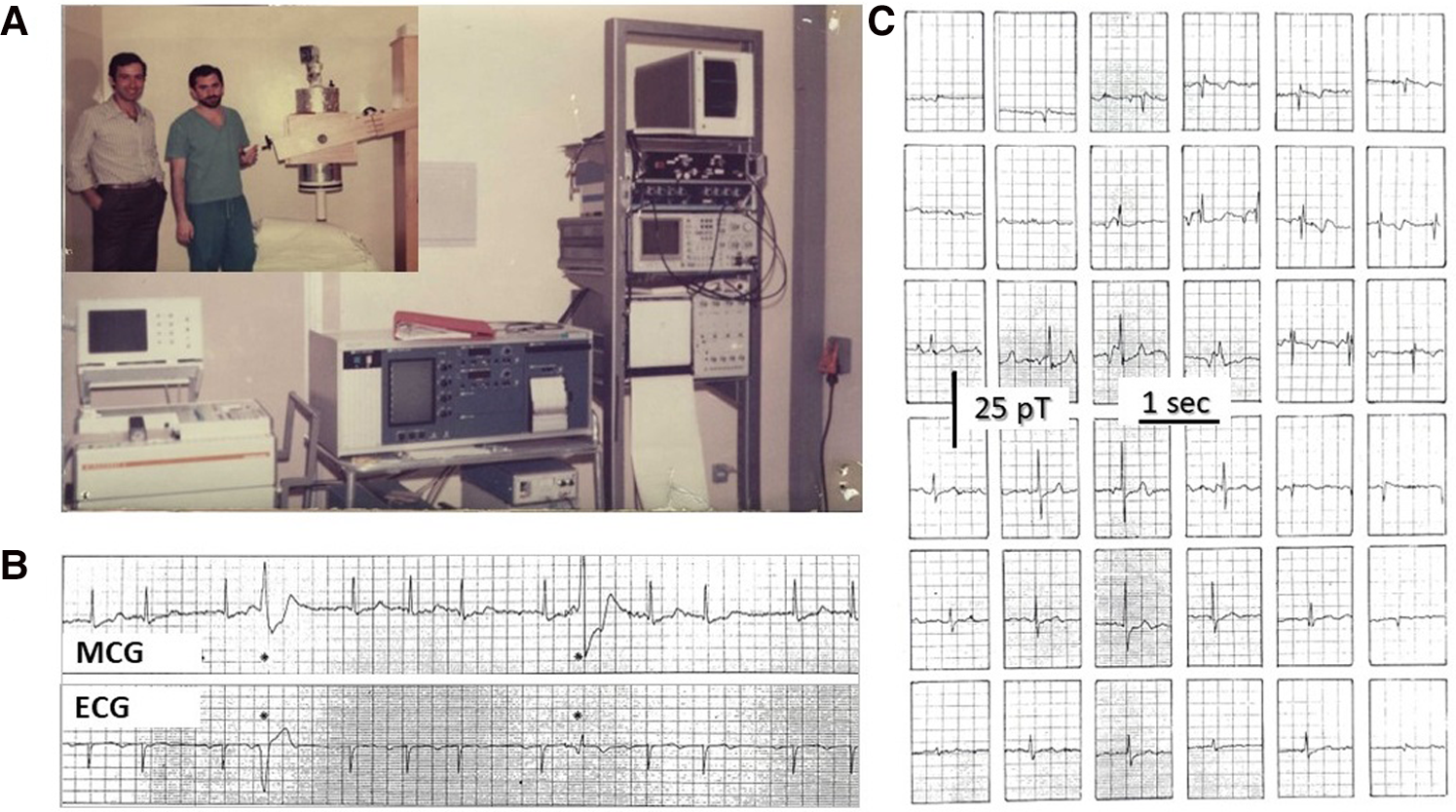 (A) CNR's physicist Gian Luca Romani (left) and Riccardo Fenici (right) testing the prototype of the CNR unshielded MCG SQUID gradiometer at the Catholic University's Gemelli Hospital in Rome. (B) Example of real-time simultaneous MCG and ECG recordings and (C) example of 36-position real-time single-beat MCG recordings (Finnish grid) [modified from (98)].