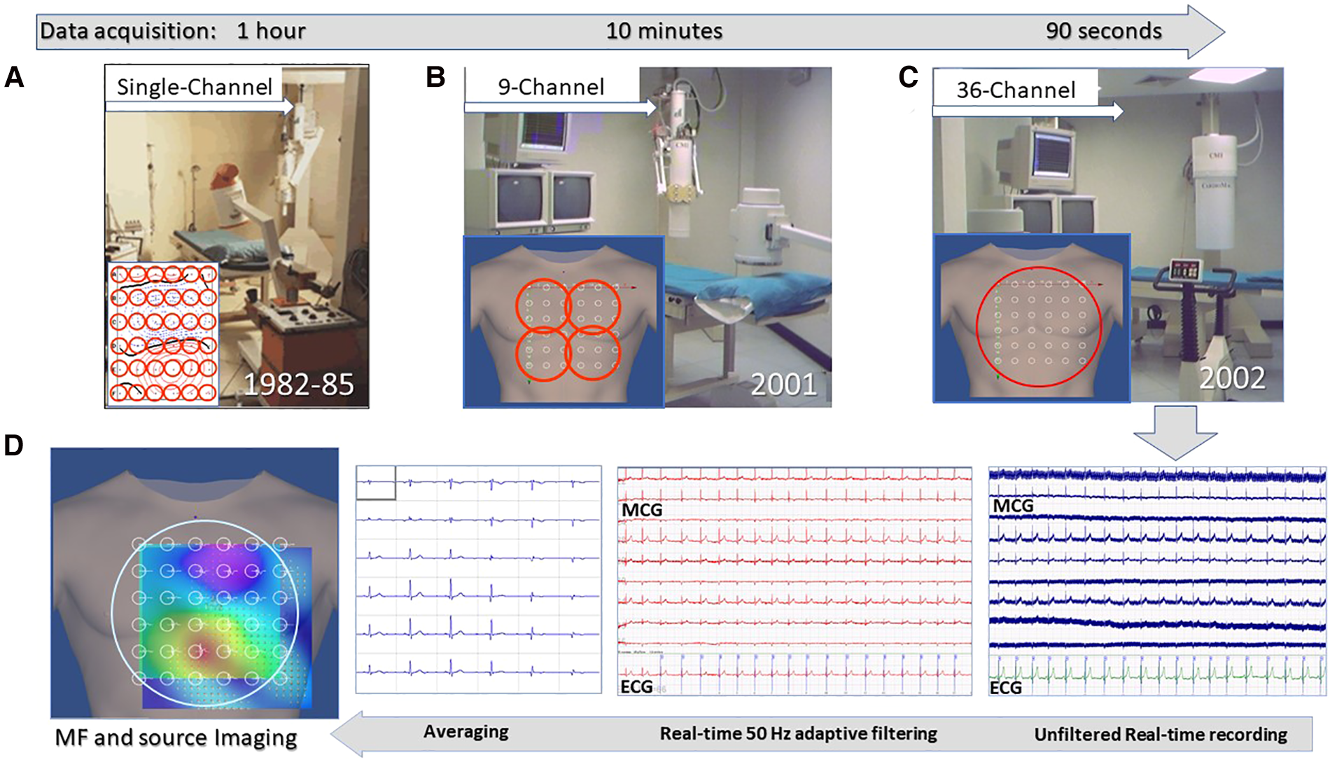 Unshielded magnetocardiography at the Catholic University Hospital's BACPIC: (A) Single-channel system; (B) Nine-channel CMI prototype; (C) CMI 3619a 36-channel; and (D) examples of real-time MCG recordings and of the signal processing flow chart for MF imaging and 3D source localization.