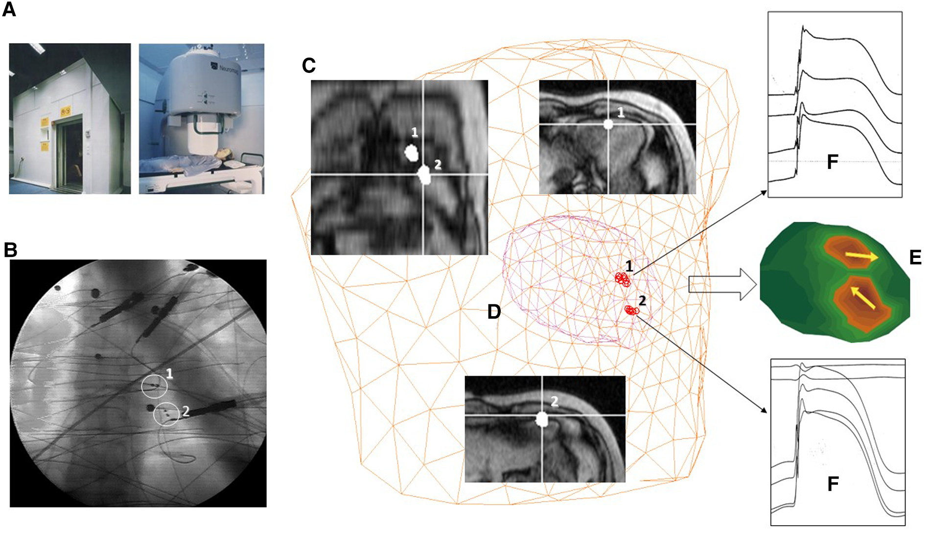 Example of multimodal 3D EAI based on MSI validated in the Helsinki University Central Hospital's BioMag Laboratory. (A) The MSR. (B) Fluoroscopic imaging of two amagnetic catheters (ACs). (C) MRI imaging. (D) 3D localization of the distal end of the ACs with the MCG ECD inverse solution. (E) 3D current density imaging of two 10 µA current dipoles generated by the ACs. (F) Multiple monophasic action potential recordings from the ACs.