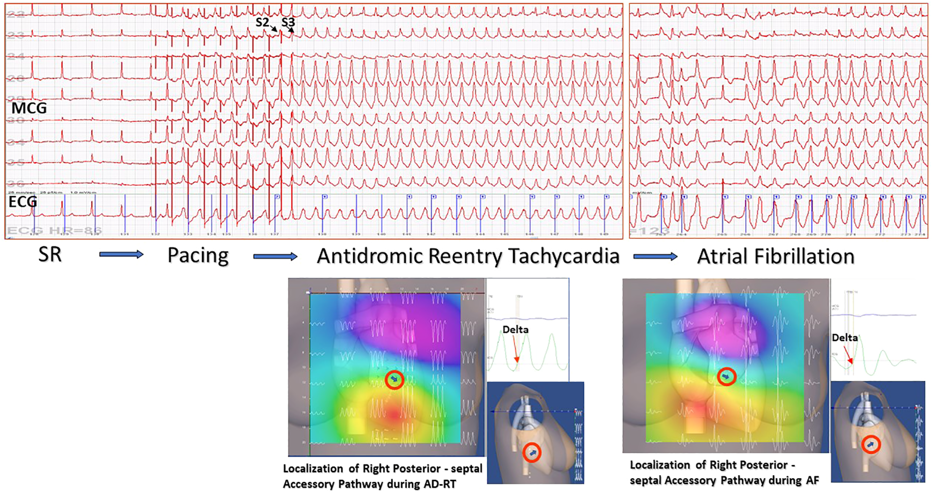 Example of non-invasive MCG localization of a right posterior-septal Kent bundle during sustained antidromic reentry tachycardia induced by transesophageal atrial pacing and spontaneous desynchronization in atrial fibrillation. The accessory pathway localization was confirmed by successful RF ablation.