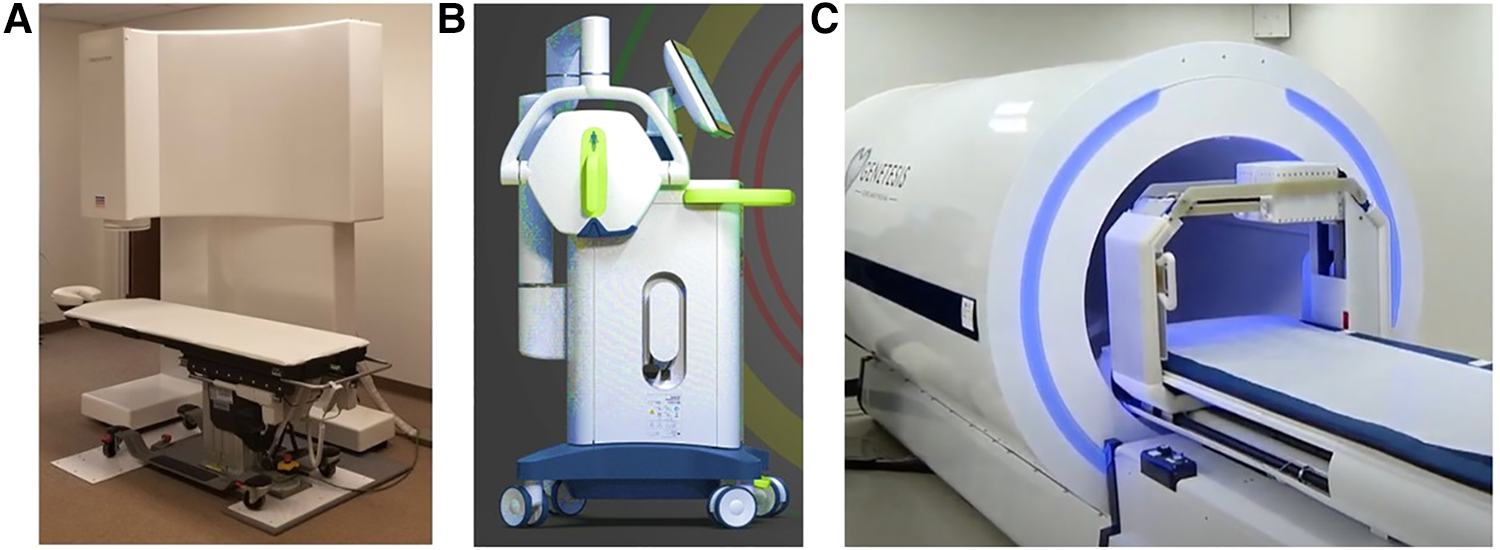 Examples of most recent novel MCG devices, two operating unshielded: (A) the cryogenic Avalon-H90. (B) The portable VitalScan/Corsens and one still requiring local EMS provided by a more compact cylindric MSR. (C) The CardioFlux, featuring zero-field OPMs.