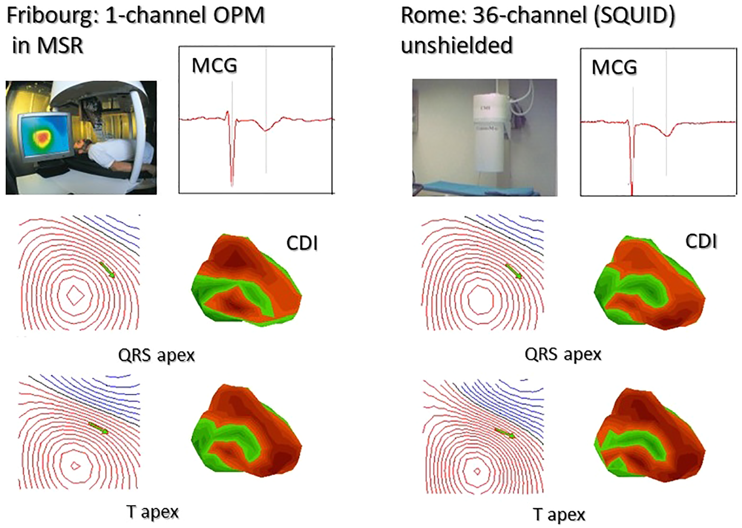 First reported comparison between sequential 36-point MCG recording with a single-channel OPM developed at the University of Freiburg (Swiss) and 36-channel MCG mapping at the Catholic University Hospital in Rome. All data were converted to the same format and analyzed with the Neuromag MCG software. The identity of MCG waveforms, of the MF distribution, of the related source localization (green arrows onto the MF maps), and of the 3D current density imaging (CDI), calculated at the apex of the QRS and of the T waves, is immediately evident [modified from data in (275)].