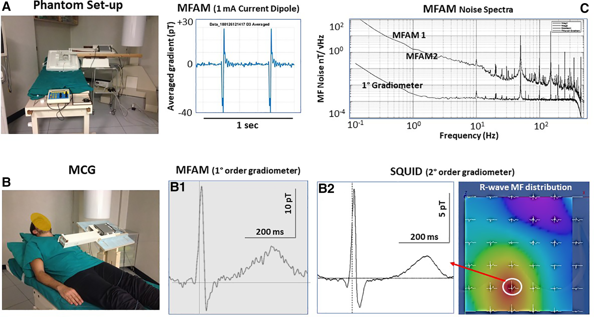 First reported test of a dual-channel scalar field OPMs (geometrics MFAM) arranged as a first-order gradiometer (baseline 5 cm) in the Catholic University Hospital's unshielded BACPIC: (A) Preliminary phantom measurement of a 1 mA current dipole generated by the amagnetic catheter. (B) Comparison between MCG recording and CMI 36-channel MCG mapping (R-wave MF distribution). The similarity of MCG waveforms recorded with the MFAM (B1) and with the SQUID (B2) at the same grid position (white circle onto the MF map) is evident. The amplitude of the MCG signal recorded with the MFAM is higher because the OPMs can be placed closer to the chest. (C) Noise spectra of each MFAM and of the first-order gradiometer.