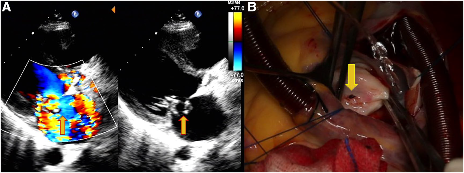 Echocardiography data of a 31-year-old female patient with shortness of breath, palpitations, and fever for 7 days. (A) Perforation of the MVA and regurgitation (yellow arrows). (B) Site of the MVA perforation during surgery (yellow arrows).