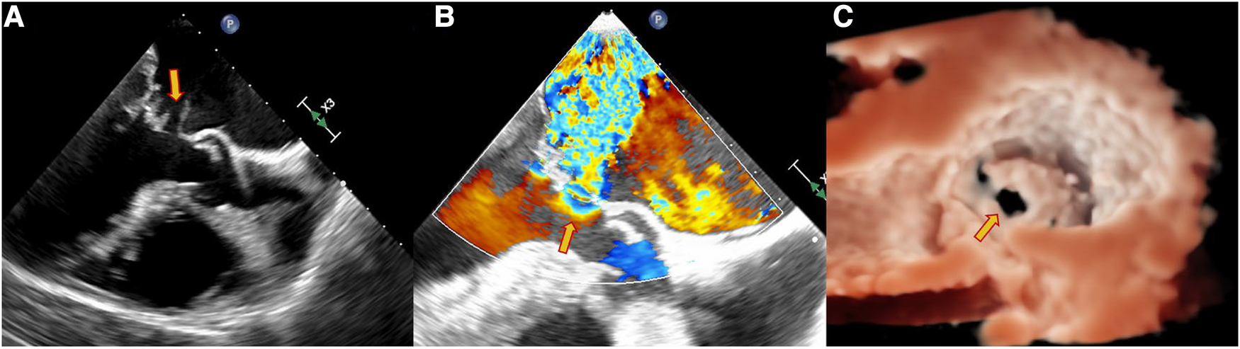 Echocardiography data of a 63-year-old male patient with dyspnea for 4 days. TEE showed the perforation of the MVA as pointed out by the yellow arrow. (A) Continuous interruption of the MVA wall. (B) Regurgitation from the MVA. (C) Continuous breaks on the MVA from a 3D view.