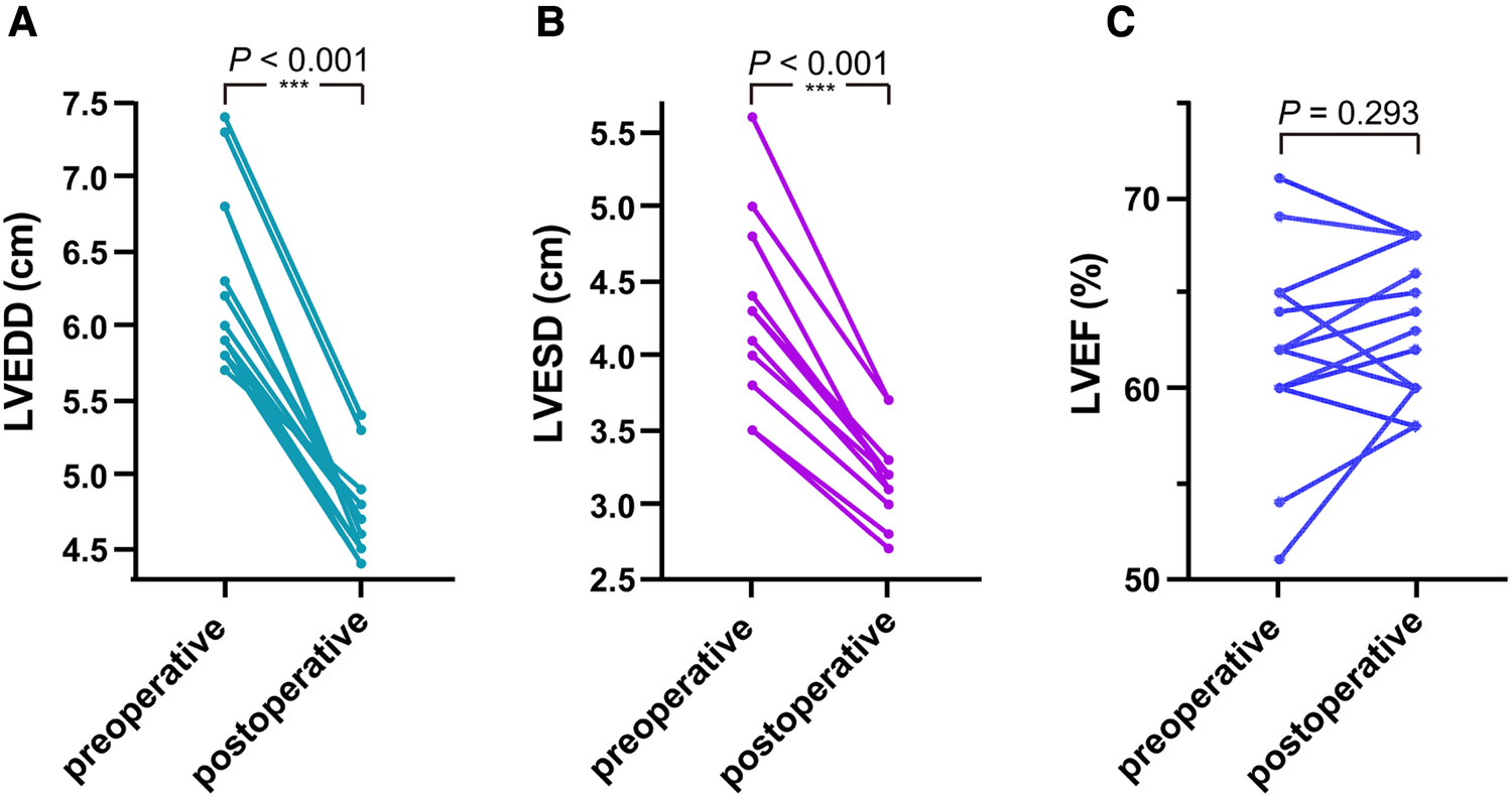 Continuous variables were described as average and standard deviation, and categorical variables were described as counts. Two two-sided tests were performed. First, the Wilcoxon signed-rank test was applied to determine the significant differences in the MR and AR degrees between the first diagnosis and the latest follow-up. Second, a paired t-test was applied to determine the significant differences in the cardiac systolic function and left ventricular measures between the first diagnosis and the latest follow-up. The significant difference threshold was P < 0.05, and the statistical analysis was performed using SPSS 25.0 software.