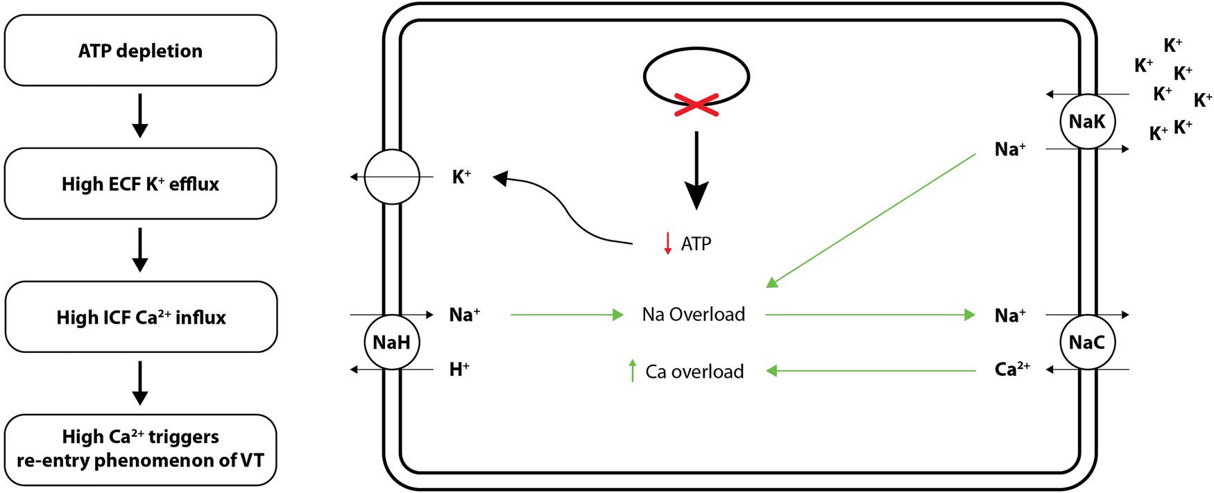 To elaborate, “metabolic sink theory” suggests that long-term pressure and volume changes in VT patients, harbour high Ca+ ions in cardiomyocytes, forming “metabolic” sinks of current. As mentioned above, O'Rourke's lab created the first cardiac cell model to link: (1) ion fluxes, (2) energy-consuming reactions (e.g., myosin ATPases), and (3) energy production. With respect to hemodynamic homeostasis, they have reported that growth and remodelling, i.e., thickening, and lengthening of cardiac myocytes translates into electrophysiological alterations that could lead to the “re-entry” phenomenon in VT (13, 14). Further, ischemia in VT translates into metabolic stress in the form of free radicals, which shortens cardiomyocyte action potentials. As per the “energy starvation theory”; because ATP is required for normal systolic and diastolic contractile function, ATP concentration and consequently the ATP/ADP ratio falls in failing human heart conditions such as the ventricular tachycardia (VT) as ATP generating pathways, e.g., the creatine kinase (CK)-phosphocreatine (PCr) system fails out. A decrease in the cellular ATP/ADP ratio activates K+ATP channels, resulting in significant ECF K+ outflow. Of note, low K+ concentration inside the cells also stimulates influx of Ca+ ions from intracellular fluid (ICF) (13). The primary outcome of “metabolic sink theory”; model is depicted in Figure 1.