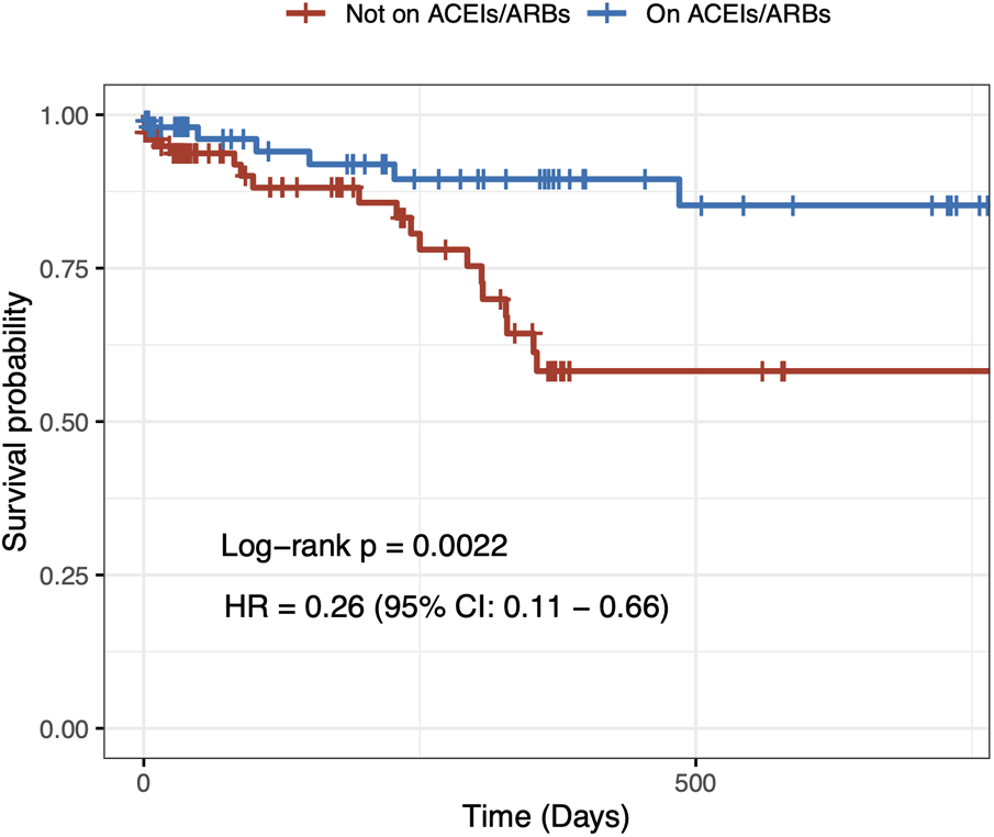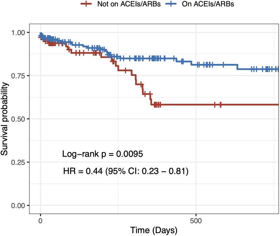 The propensity score model was developed using logistic regression, which modeled the likelihood of treatment with ACEIs/ARBs at baseline. This model included variables that significantly varied (p < 0.1) between patients who were on ACEIs/ARBs and those on other antihypertensive medications, and these variables were heart failure, sex, CKD, and atrial fibrillation. A 1:1 ratio propensity score matching was performed using a greedy nearest neighbor algorithm, which resulted in a propensity score–matched cohort comprising 210 patients—105 receiving ACEI/ARB therapy at baseline and 105 not receiving them. Standardized differences are reported when comparing baseline characteristics. To account for the matched nature of the data, the log-rank test and Cox proportional hazards regression were used to conduct survival analyses.