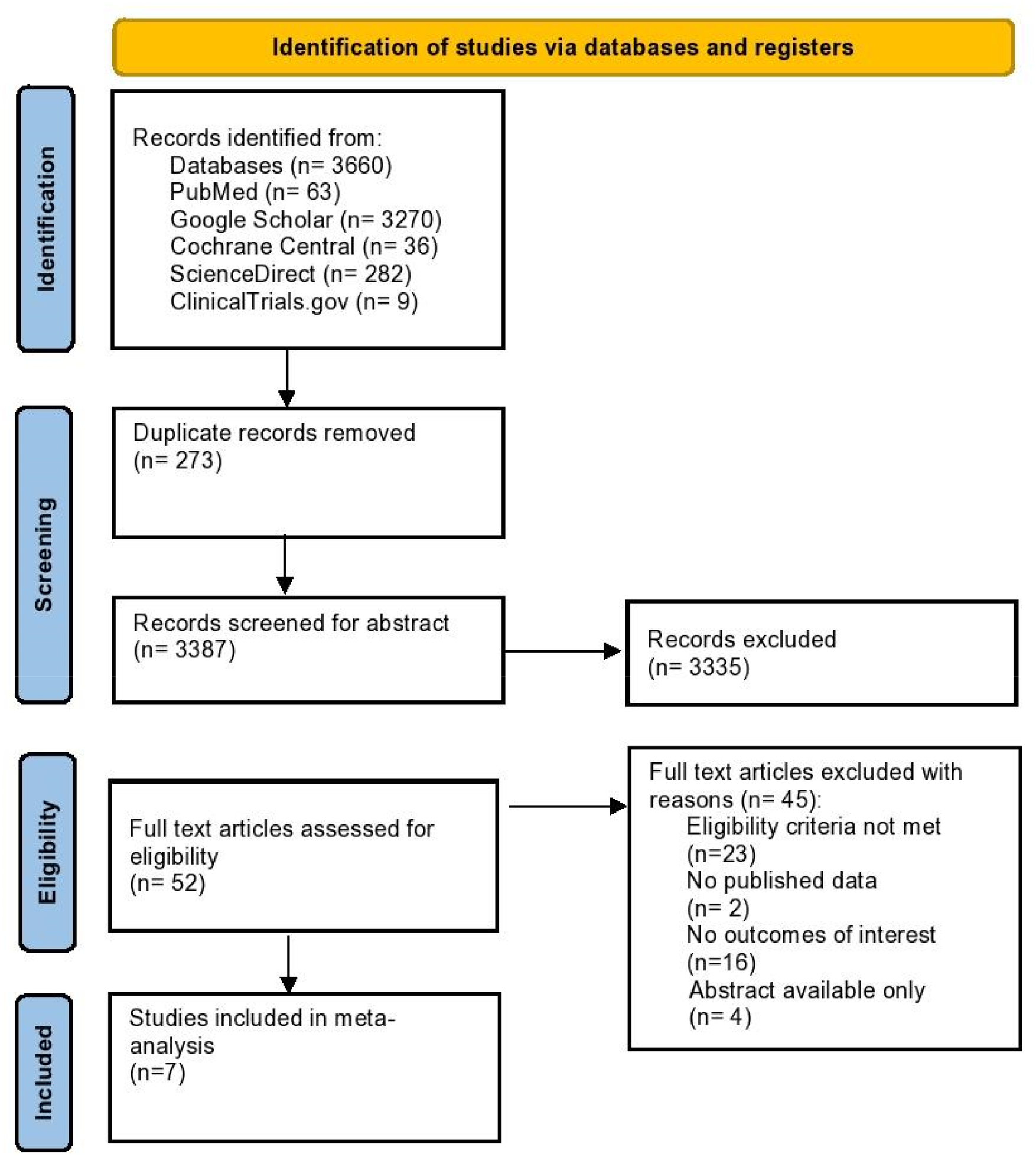 An initial search of 5 electronic databases and a few other sources provided 3,660 studies, out of which 3,387 records were left after removing the duplicate studies. 3,335 studies were eliminated after the title and abstract screening. After a full-text review of 52 articles which were assessed for their eligibility, 45 articles were excluded which did not meet the inclusion criteria. Consequently, 7 RCTs were finalized for this meta-analysis (16–22). A complete literature search has been highlighted in the PRISMA flowchart in Figure 1.
