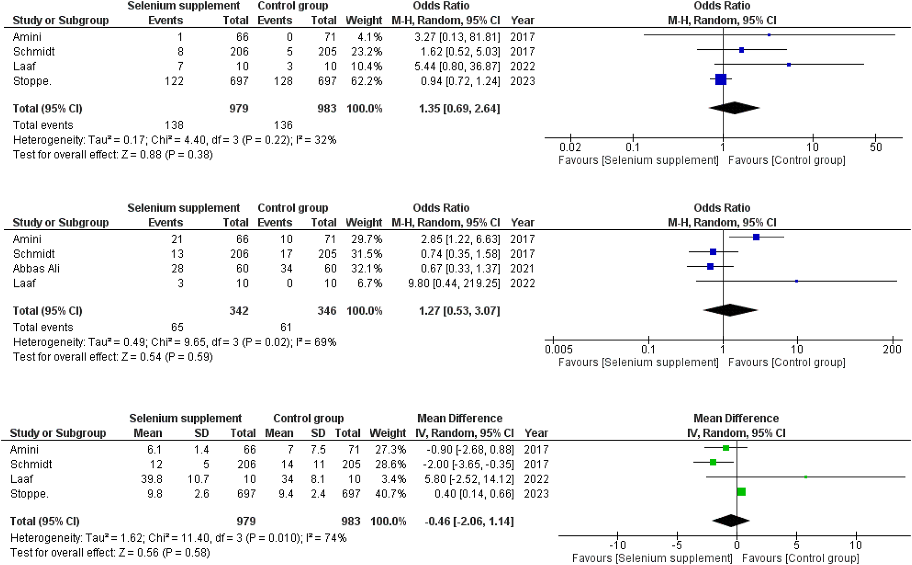(A) Forest plot depicting odds ratios for mortality in selenium supplemented vs. control group patients. (B) Forest plot depicting odds ratios for AKI in selenium supplemented vs. control group patients. (C) Forest plot depicting mean differences for LOS in hospital in selenium supplemented vs. control group patients.