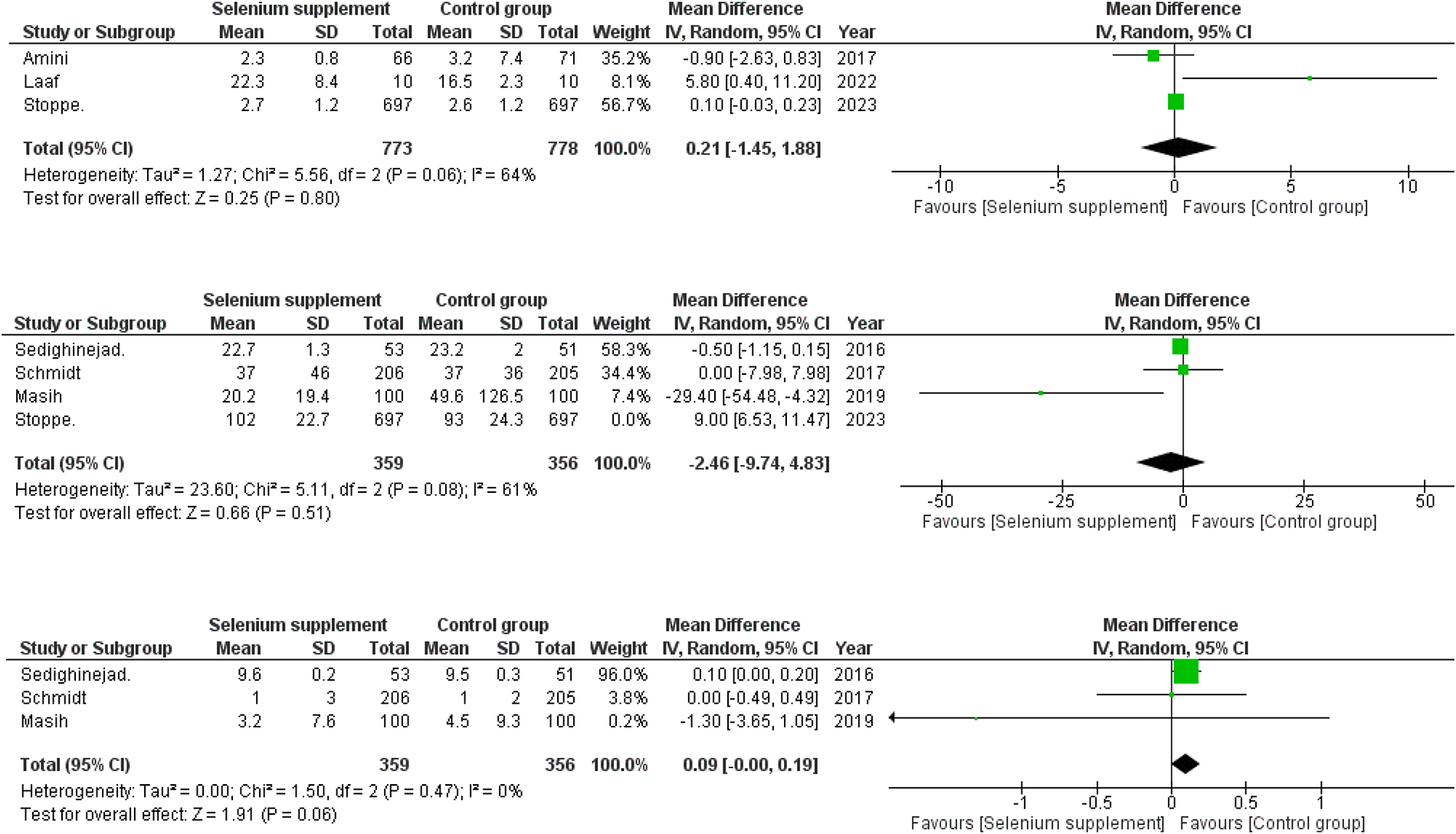 | Masih (22) | Randomized controlled trial | Iran | 1,000 µg sodium selenite | CK-MB and Troponin I levels immediately post op, 6 h, and 24 h after surgery | CABG (n = 67; 100%) |