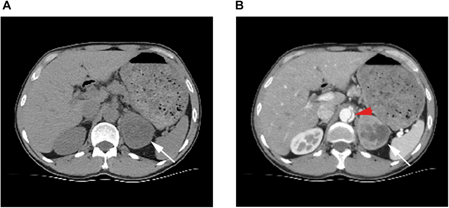 (A) Ct scan showing a soft tissue mass in the left adrenal gland with uneven internal density, clear borders, and regular shape. (B) White arrows point to the left adrenal mass in the arterial phase, which is significantly enhanced and necrotic inside. Red arrows point to dissection of the abdominal aorta.
