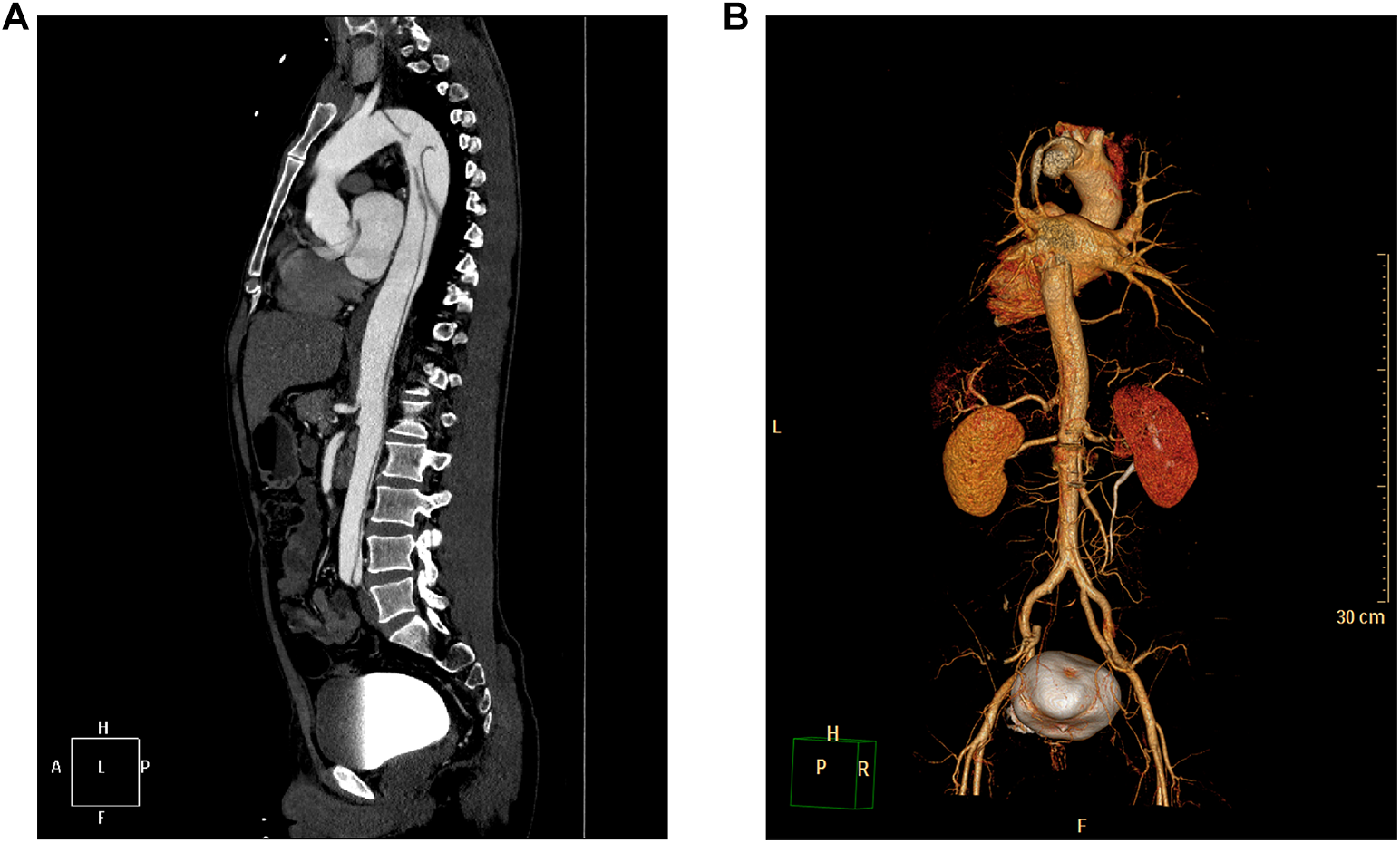 CTA showing medial migration of the intimal sheet from the descending thoracic aorta to the level of both common iliac arteries, and the lumen showing “double-lumen” changes, consistent with aortic dissecting aneurysms (Stanford type B). (A) Maximal intensity projection of the sagittal section of the aorta. (B) Three-dimensional reconstruction of the aorta.