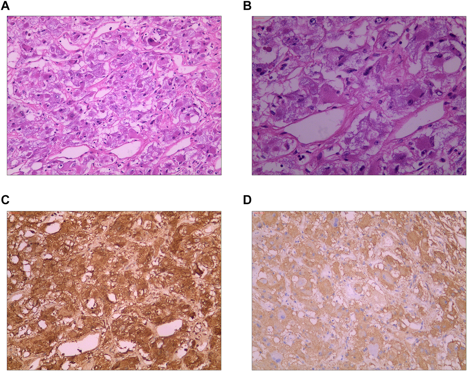 (A) Hematoxylin-eosin staining (HE) showing that the tumor cells were distributed in nests and beams, and thin-walled and reticular blood vessels were abundant between the cell nests (10 × 10). (B) Hematoxylin-eosin staining (HE) showing that the tumor cells were round or oval at high magnification, finely stained, granular, and evenly distributed, with no mitotic figures observed (10 × 20). (C) Immunohistochemical staining showing chromogranin A (CgA) (+). (D) Immunohistochemical staining showing synaptophysin (Syn) (+).
