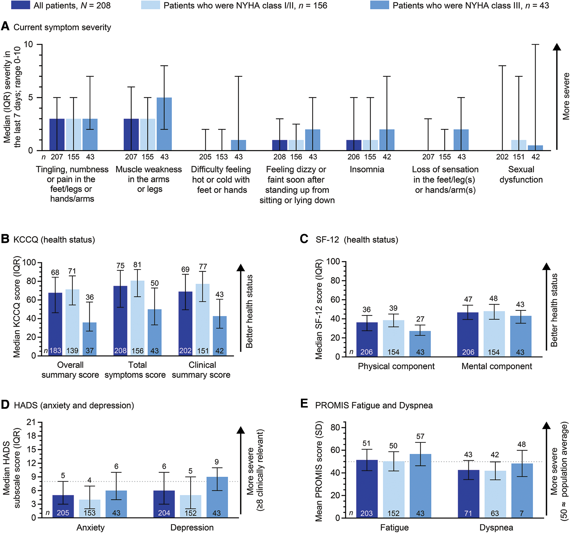 Surveys self-completed by patients included a range of questions quantifying disease burden on daily life, including symptom severity over the last 7 days (scale of 0–10) and frequency of healthcare visits in the prior 3 months. Established patient-reported outcome surveys completed by patients included the Kansas City Cardiomyopathy Questionnaire (KCCQ), the 12-Item Short Form Health Survey (SF-12) V2, the Hospital Anxiety and Depression Scale (HADS), Patient-Reported Outcomes Measurement Information System (PROMIS) Fatigue Severity Short Form 7a V1.0, and PROMIS Dyspnea Severity Short Form 10a V1.0.