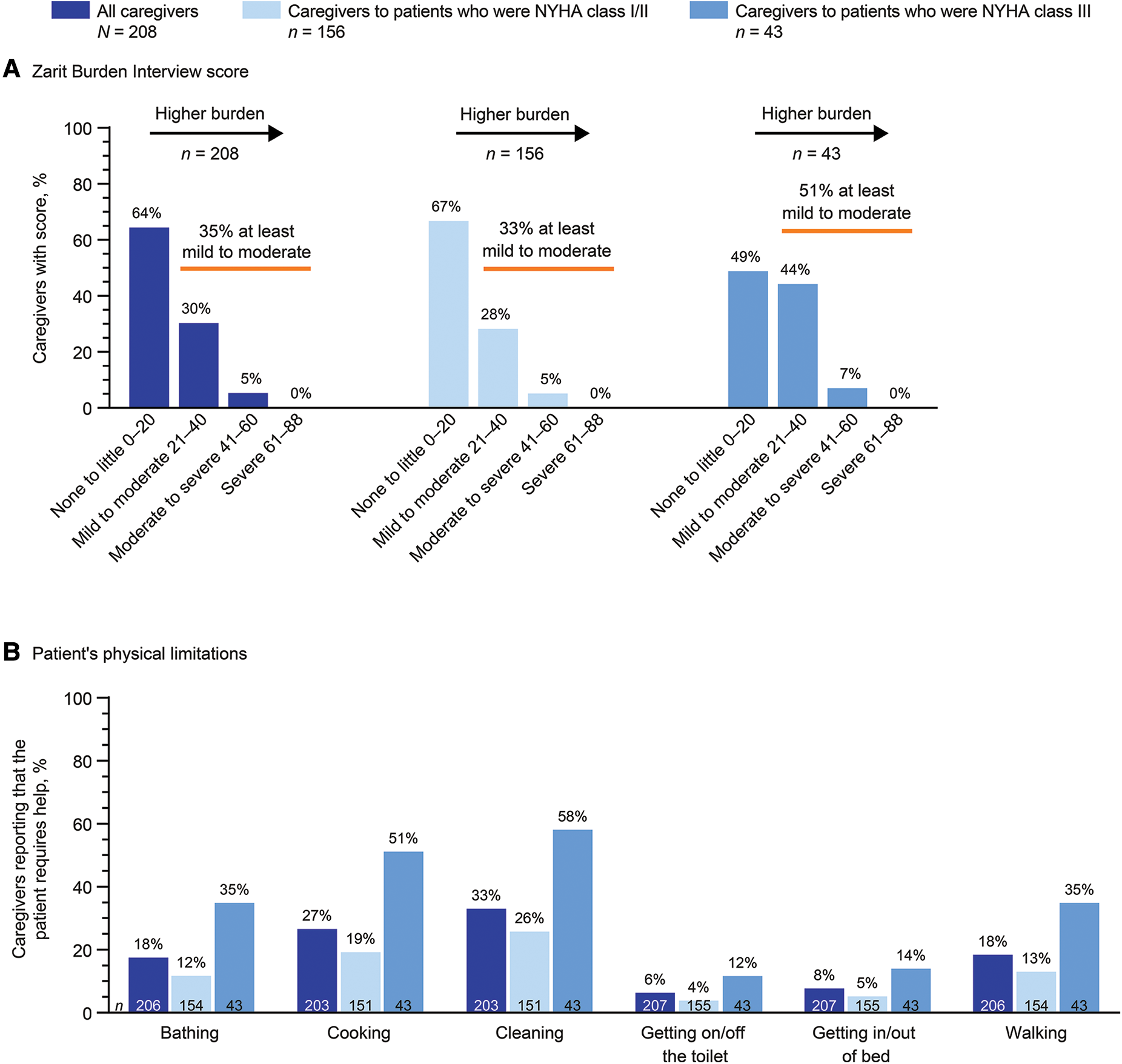 208 patient and caregiver pairs were included. 86% of patients were male, median age was 81 years, and 91% (141/155 with genetic testing) had wild-type ATTR-CM. Patient responses characterized the mental and physical burden of ATTR-CM, which was numerically higher among those who were New York Heart Association (NYHA) class III (n = 43) vs. class I/II (n = 156). NYHA class III patients had particularly low KCCQ-OS (36) and SF-12 physical component (27) scores, and 67% had a HADS depression score ≥8. Caregivers (median age 68 years; 85% female; 59% spouse of the patient; median duration of caregiving 1.5 years) reported that NYHA III patients more frequently required help with a range of physical activities than NYHA class I/II patients. 51% of caregivers to NYHA class III patients reported at least a mild-to-moderate burden in the ZBI. A plain language summary of this paper can be found as a supplemental material.