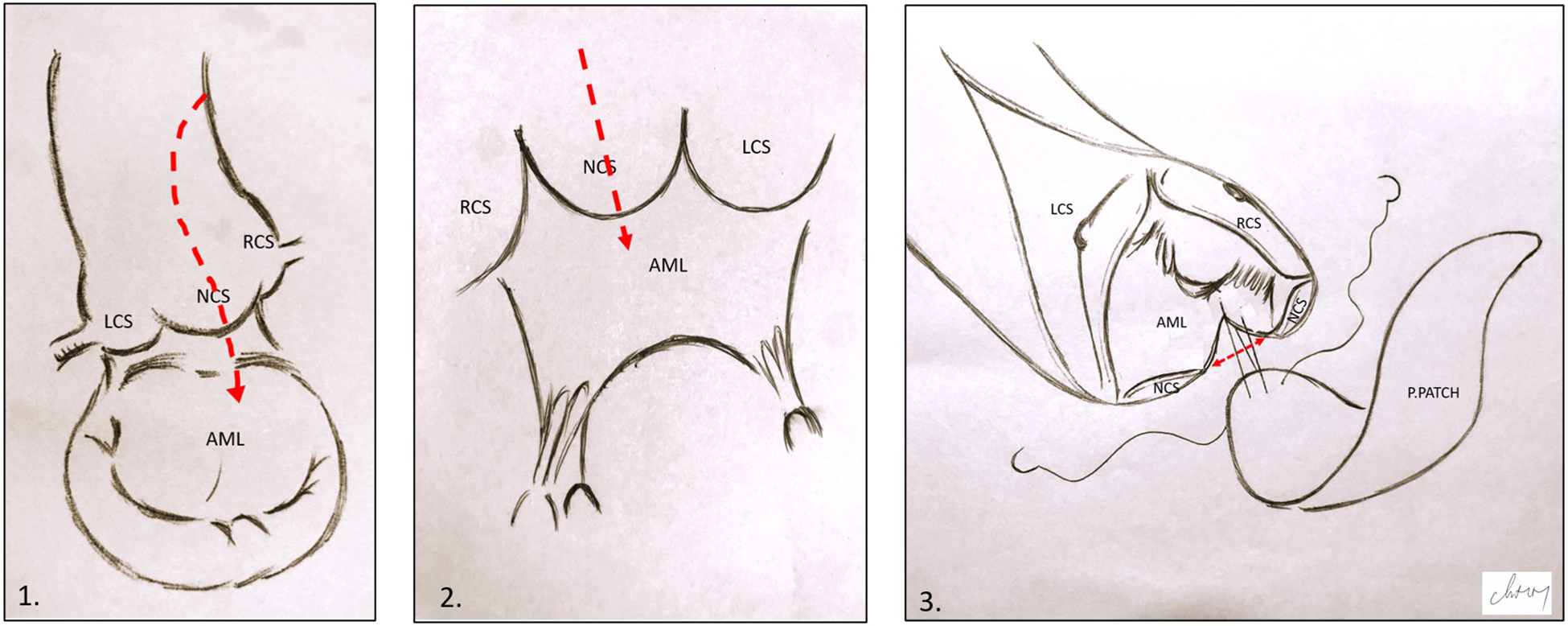 Illustration of Nick's technique. (1) and (2) Hockey stick aortotomy extended in the middle of the NCS and the anterior mitral leaflet. (3) Pericardial patch suturing; the red arrow shows the opening in the aortic annulus and AML. LCS, left coronary sinus; RCS, right coronary sinus; NCS, non-coronary sinus; AML, anterior mitral leaflet; P.PATCH, pericardial patch.