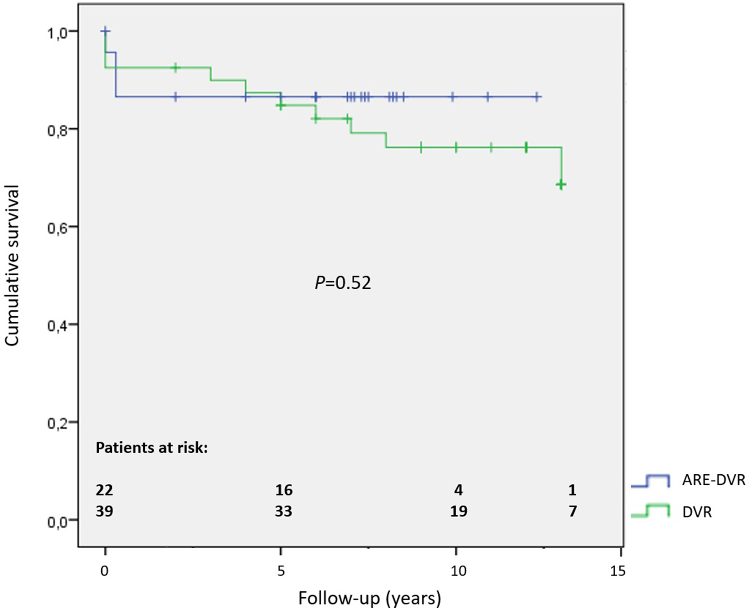The aortic cross-clamping duration was greater in the ARE-DVR group (177.6 ± 37.9 min vs. 148.3 ± 66.3 min, p = 0.047). The operative mortality rate was 5.6% for the entire cohort, and no statistically significant difference was found between the groups (ARE-DVR: 8% vs. DVR: 4.5%, p = 0.46) (Table 3). Table 4 summarizes the clinical data of the deceased patients. The postoperative mean aortic gradient was 19.68 ± 7.20 mmHg (range: 6.14–24 mmHg), with no statistically significant differences between the groups (ARE-DVR: 16.2 ± 9.9 mmHg vs. DVR: 17.3 ± 6.6 mmHg, p = 0.62). Table 5 reports the post-operative events according to age. At a mean follow-up of 6.9 ± 3.9 years, the estimated 5-year survival rates for ARE-DVR and DVR were 86.5 ± 7.2% and 89.9 ± 4.8%, respectively (p = 0.52) (Figure 2). Only one patient in the ARE-DVR group had undergone reoperation at follow-up for prosthetic valve endocarditis (n = 1/22, 4.5%).