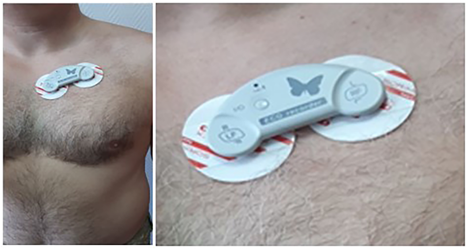 ECG “Butterfly” patch recorder—mounting under the left collarbone.