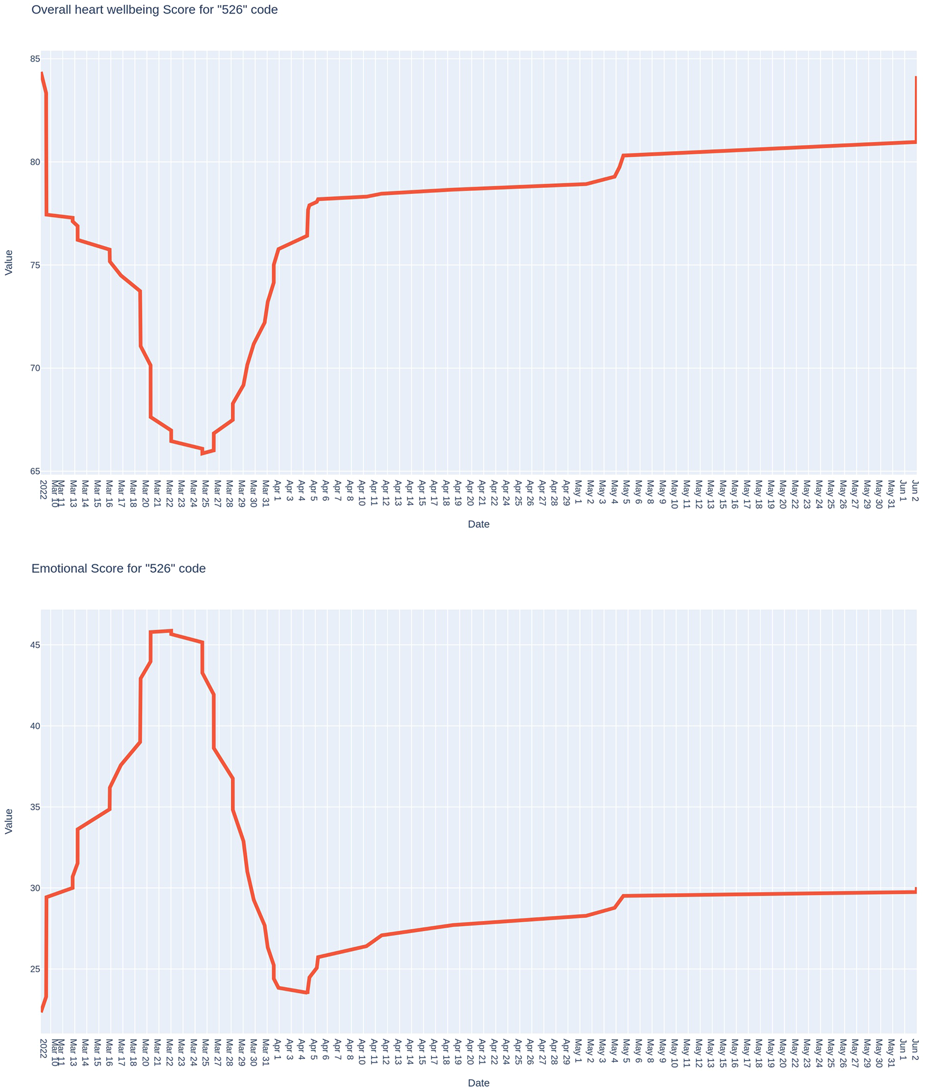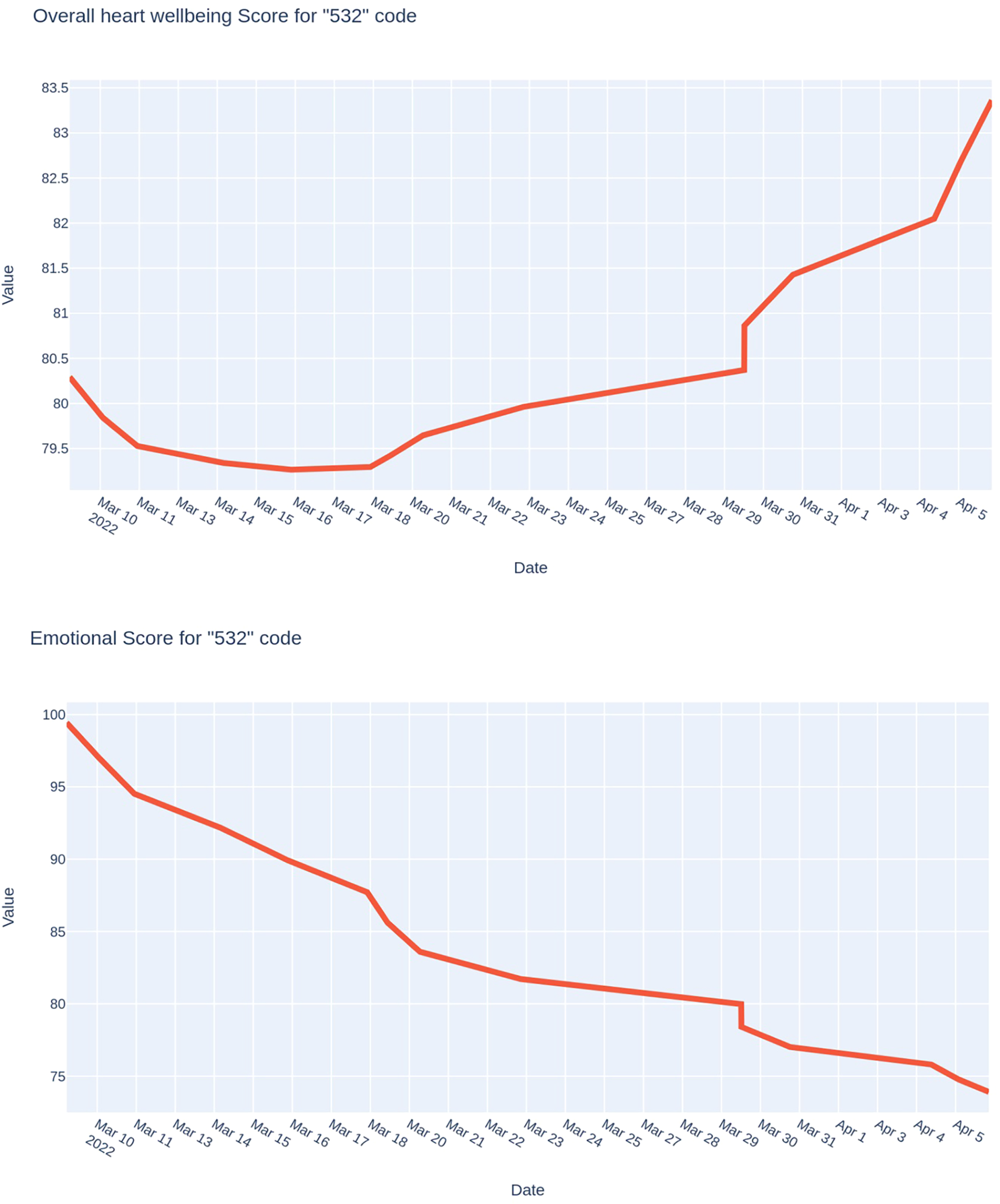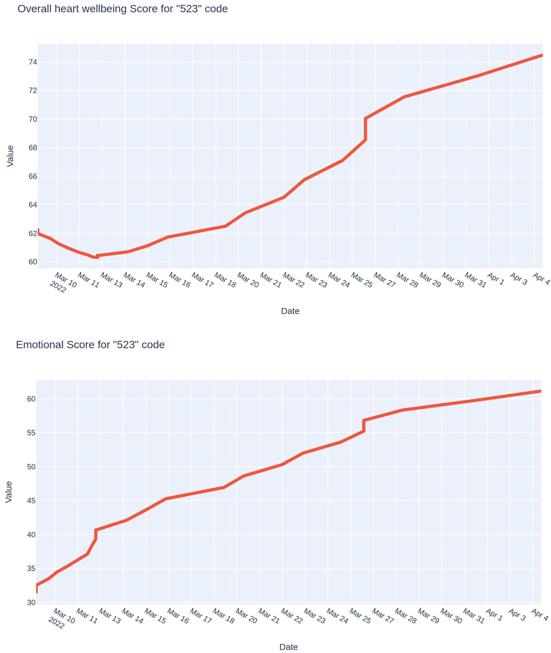 The following case (Figure 7) demonstrates the results of monitoring also during one month of an officer of the Defense Forces of Ukraine, who was under the influence of severe stress as his family was in a temporarily occupied settlement in the Kyiv region. Compared to the previous case, we can see the opposite trend: a smooth increase in the values of both indices that were studied. The dynamics of the psycho-emotional state index are particularly characteristic: it was extremely low (around 25 points) at the beginning of the research period. It increased to 60 points after the liberation of the occupied settlement and reunification with the family.
