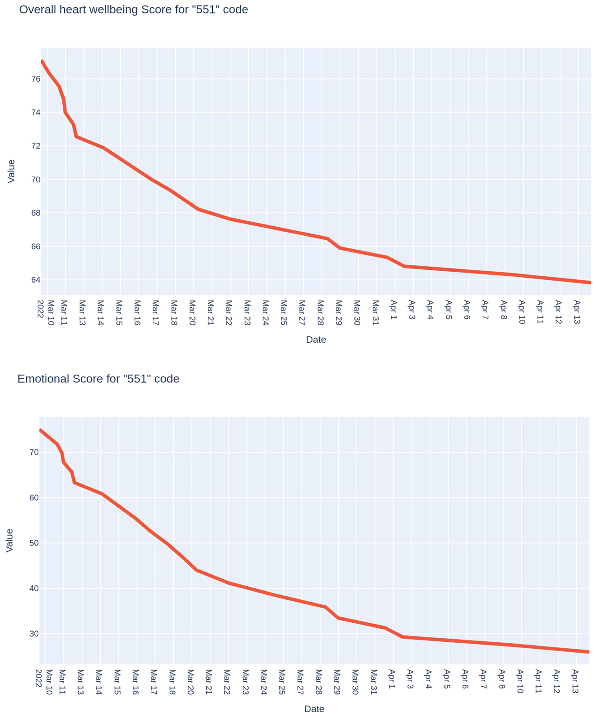 The third example is the monitoring results of the chief officer, the combat unit commander (Figure 6). It was carried out for one month, from mid-March to mid-April. We see a smooth decrease in both indicators: from approximately 75 points to 65 points in the case of the integral indicator of the functional state and, even more significantly, to 40 points in the case of the psycho-emotional state indicator.