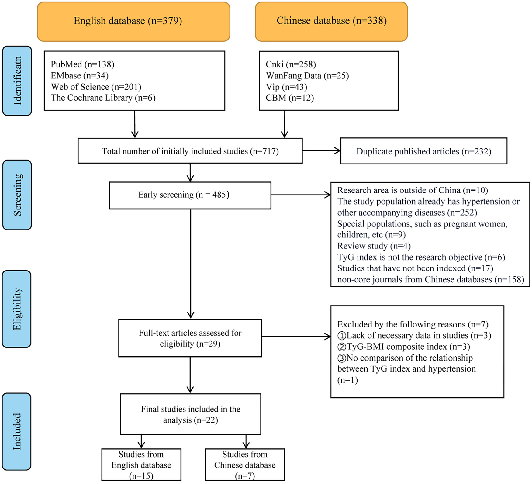 According to a predetermined search strategy, we obtained a total of 717 pre-screened studies by searching Chinese and English databases. After briefly reading the abstracts, we excluded duplicate publications and articles that did not meet the inclusion criteria. We then read the remaining 29 studies in detail and excluded studies reporting unclear results, incomplete content, or those that did not directly address the association between TyG index and hypertension. Ultimately, 22 studies were included in our meta-analysis, as shown in Figure 1.