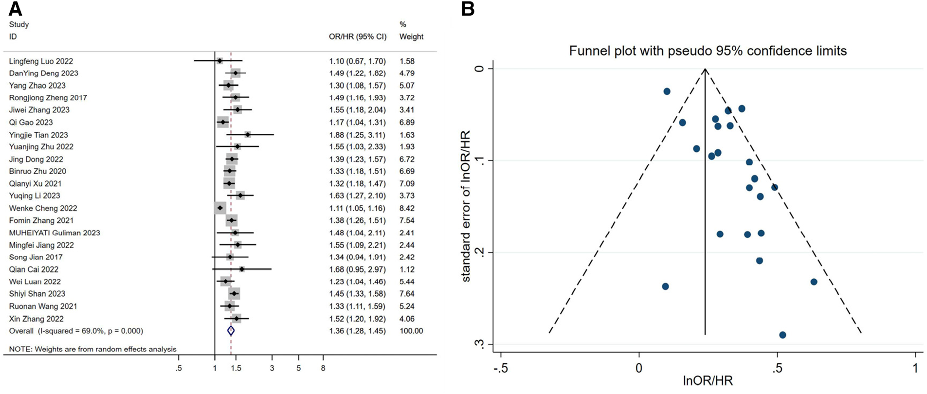 After including continuous-type variables from 22 studies and performing a meta-analysis, we found that elevated TyG index increased the risk of developing hypertension, or that this would result in significantly higher blood pressure in patients [OR/HR = 1.36 95%CI (1.28, 1.45), P < 0.001, Figure 2A].