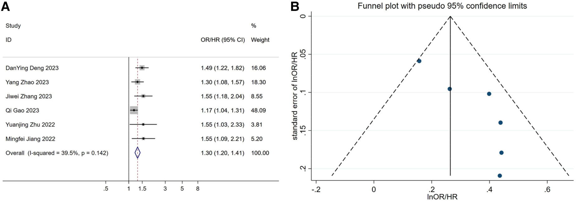 (A) forest plot of the association between TyG index and the risk of hypertension. (B) Funnel plot of the association between TyG index and the risk of hypertension. OR: Odds Ratio; HR: Hazard Ratio.