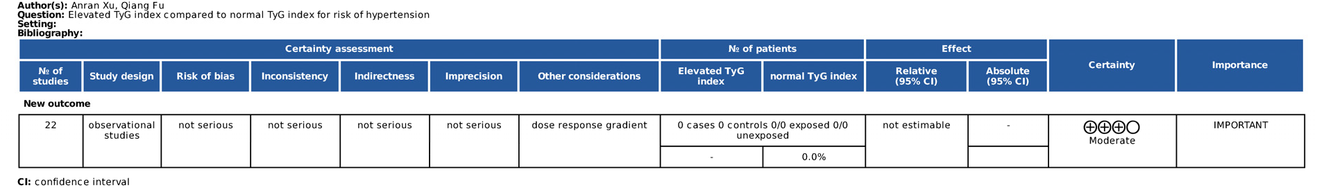 Articles meeting the following criteria will be included in the meta-analysis: Inclusion criteria (1) Study design: Observational studies (Cross-sectional studies, Cohort studies, etc.). (2) Methods and outcomes: Any study reporting associations between the TyG index and hypertension. Exclusion criteria: (1) Studies conducted outside of China; (2) Studies lacking relevant OR, RR, or HR values for necessary outcome reporting; (3) Studies without direct comparison of hypertension and the TyG index; (4) Studies without reporting of any excluded confounding factors; (5) Non-core journal papers published in Chinese databases; (6) The journal where the study is published has been removed from the database; (7) Repeatedly published articles, conference proceedings, and reviews; (8) Special groups, such as pregnant women, children, etc. Two researchers(AR Xu, QY Jin) independently screened the studies and discussed and resolved the controversial ones.