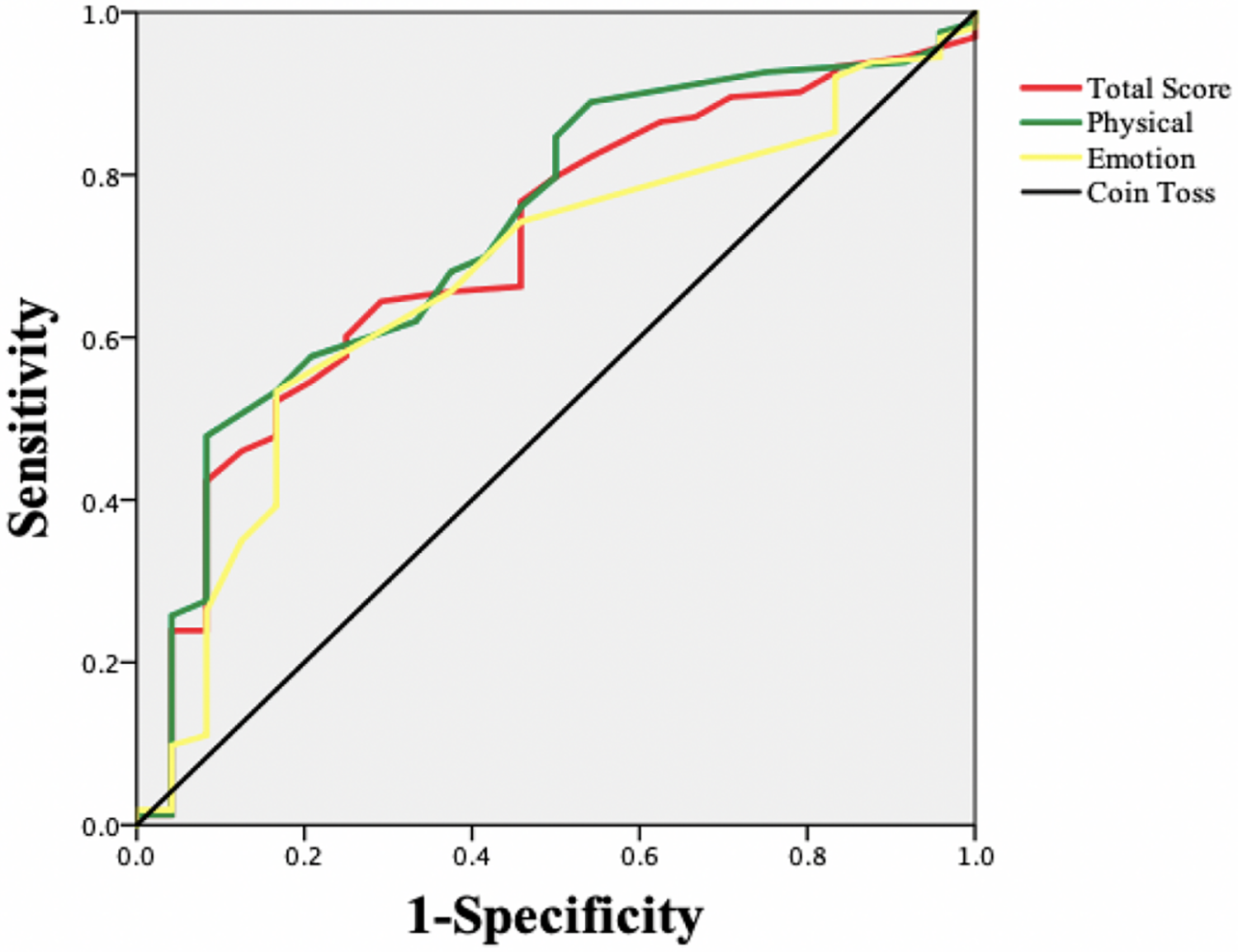 An ROC curve was constructed taking the HT classification as the “gold standard” and the MLHFQ as the new standard for evaluation (Figure 1). Improvement in health status was defined as positive, and no improvement in health status was defined as negative. Table 4 shows that the areas under the ROC curves for each MLHFQ domain constructed based on the HT anchor ranged from 0.673 to 0.732, and the MCIDs of MLHFQ physical domain, emotional domain, and total score were 9.5, 2.5, and 12.0, respectively.