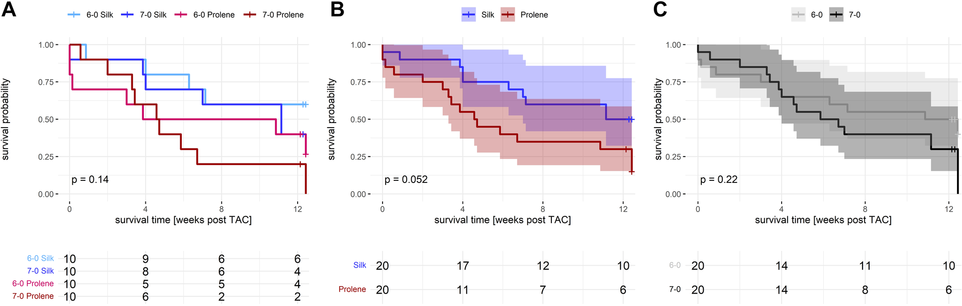 Effect of suture material and size on overall animal survival after TAC. (A) Separate Kaplan Meier plot including all 4 groups studied, 6-0 silk (light blue), 7-0 silk (dark blue), 6-0 prolene (light red), 7-0 prolene (dark red), for a followup period of 12 weeks after TAC. (B) Kaplan Meier plot comparing suture material (silk versus prolene) after pooling of 6-0 and 7-0 datasets. (C) Kaplan Meier plot comparing suture size (6-0 versus 7-0) after pooling of prolene and silk datasets. -values were calculated using a log rank test.