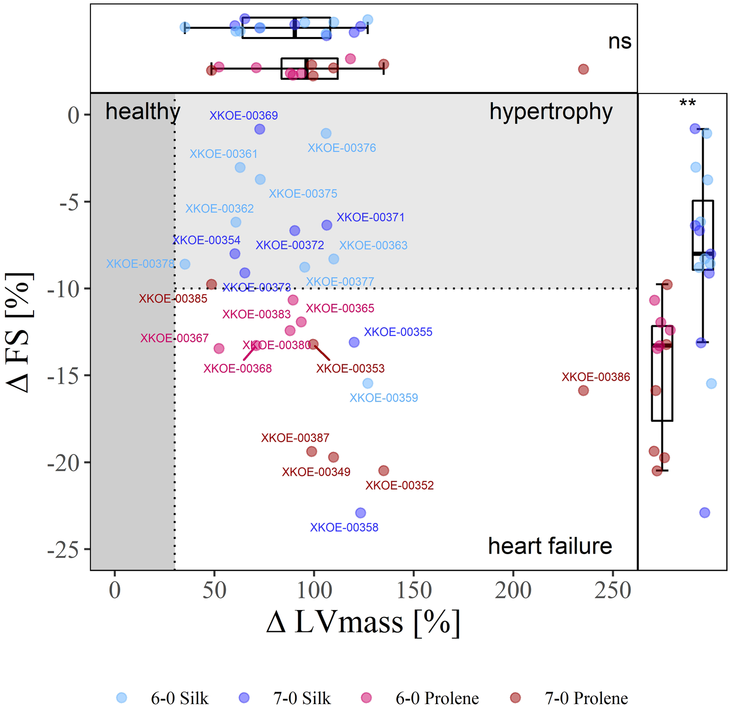 Effect of suture material and size on the severity of TAC-induced cardiac phenotype. 2D-Plot of the percentile change of FS and LVmass of all operated mice, 6-0 silk (light blue), 7-0 silk (dark blue), 6-0 prolene (light red), 7-0 prolene (dark red), derived from echocardiographic measurements before and 4 weeks after TAC. The phenotype domains “healthy” (dark grey), “hypertrophy” (light grey), and “heart failure” (white) were defined by an increase of more than 30% in LVmass and a decrease by more than 10% in FS. Each data point reflects an individual animal with respective animal-ID provided. Box plots with median, 95 % percentile and min max values of percentile change of FS and LVmass is shown at the right and top, respectively.