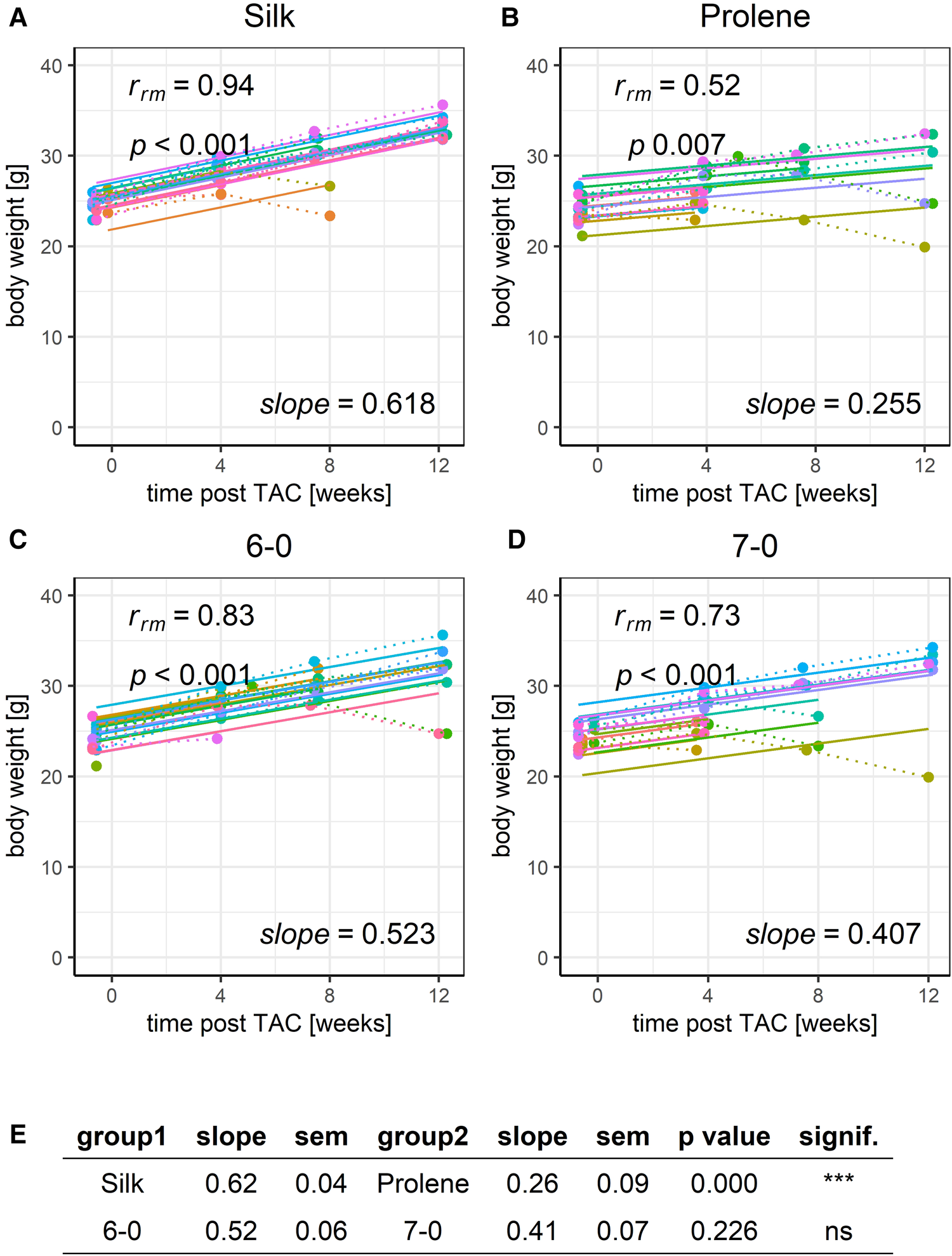 RMCA analysis of the development of body weight after TAC for all tested groups. Individual group of mice operated with either 6-0 silk (A), 7-0 silk (B), 6-0 prolene (C) and 7-0 prolene (D). Dotted lines indicate individual animal progression, straight lines indicate the RMCA fit for each animal. Respective slope factors with SEM and p-values as derived from a z-score statistic when comparing all groups across each other are given in E.