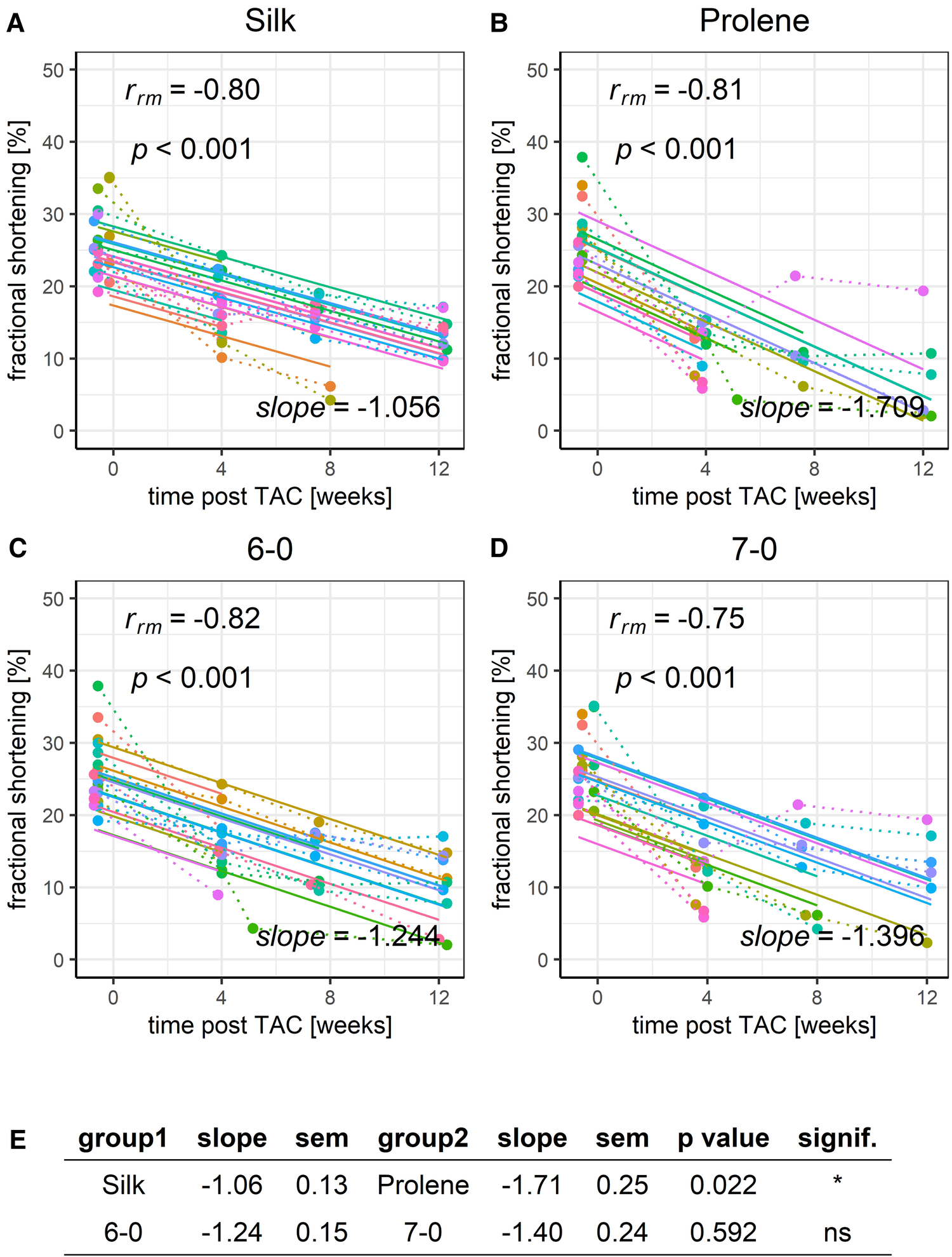 Effect of suture material and size on the development of fractional shortening after TAC. Development of animal FS within a 12-week time period after TAC for mice operated using different suture material, silk (A) or prolene (B), or using different suture size, 6-0 (C) or 7-0 (D), dotted line indicates individual animal progression, straight line indicates the RMCA fit for each animal. (E) -score statistic of the comparison of the RMCA slopes for the pooled data groups.
