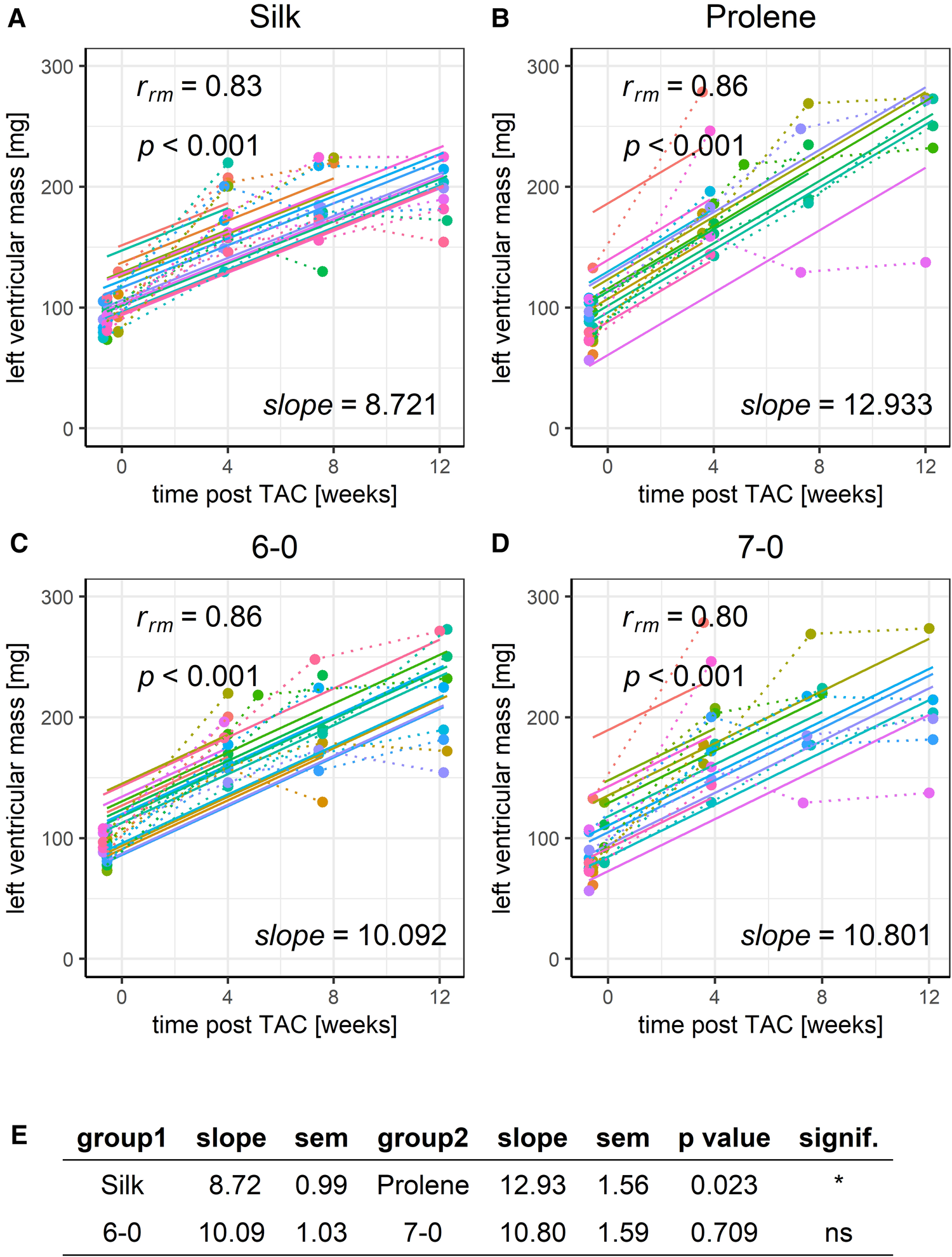 RMCA analysis of the development of LVmass after TAC for all tested groups. Individual group of mice operated with either 6-0 silk (A), 7-0 silk (B), 6-0 prolene (C) and 7-0 prolene (D). Dotted lines indicate individual animal progression, straight lines indicate the RMCA fit for each animal. Respective slope factors with SEM and p-values as derived from a z-score statistic when comparing all groups across each other are given in E.