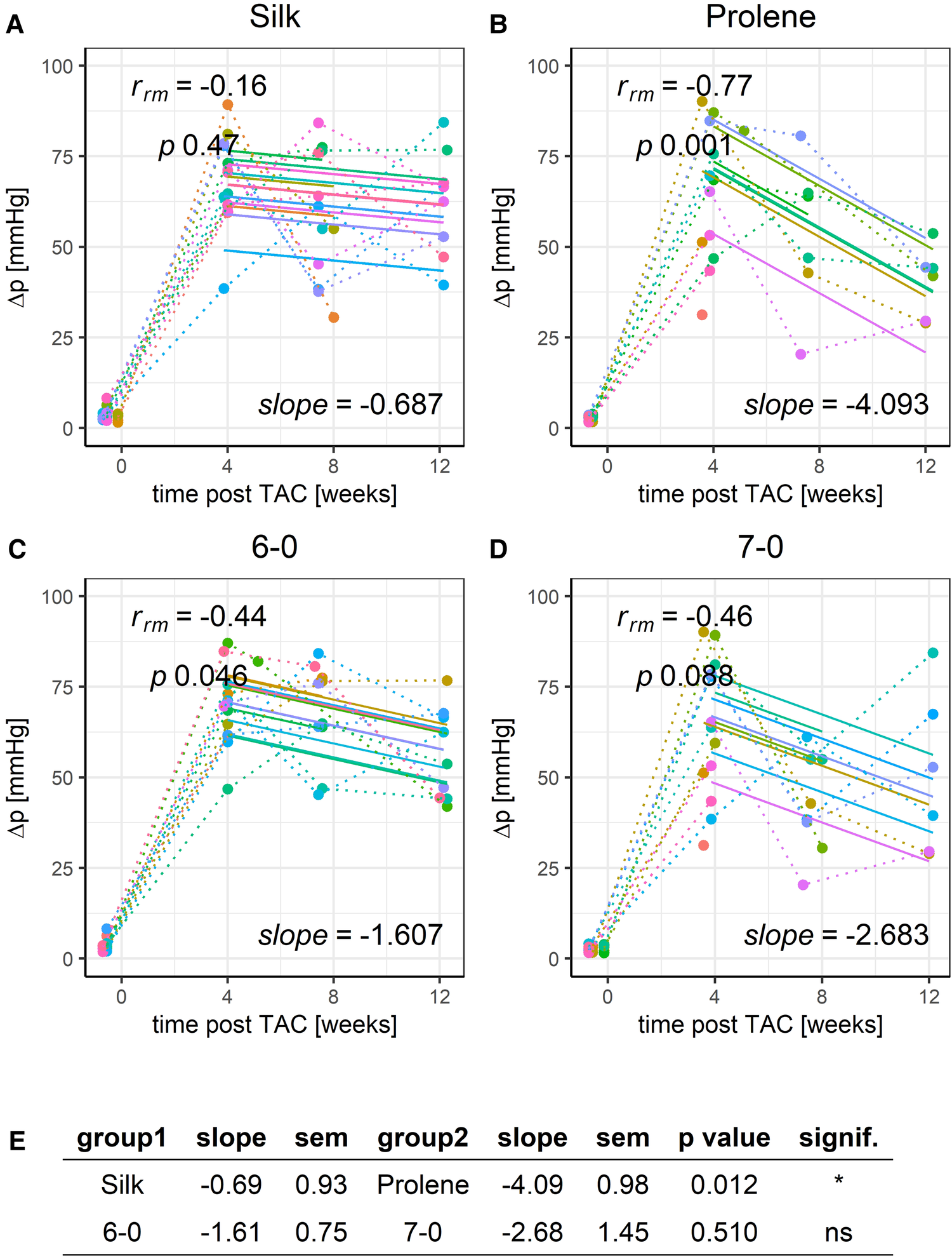 RMCA of Δp excluding animal XKOE-00385. Individual group of mice operated with either 6-0 silk (A), 7-0 silk (B), 6-0 prolene (C) and 7-0 prolene (D). Dotted lines indicate individual animal progression, straight lines indicate the RMCA fit for each animal. Respective slope factors with SEM and p-values as derived from a z-score statistic when comparing all groups across each other are given in E.