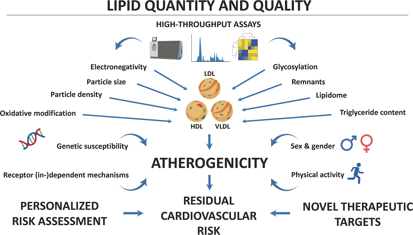 Lipids and their modifications contribute importantly to the pathogenesis of atherosclerotic cardiovascular disease (ASCVD). High-throughput technologies, including lipidomics, now allow the in-depth characterization of lipoprotein structure and function. Both physical and chemical characteristics modulate the atherogenic effects of blood lipids, but genetic susceptibility, sex and gender, physical activity, and receptor (in-)dependent mechanisms can determine their (cardio-)vascular effects. A better understanding of how these biomarkers contribute to ASCVD pathogenesis may allow for personalized risk assessment and the identification of novel therapeutic targets, aimed at reducing residual cardiovascular risk and thus improving outcomes of patients at particularly high cardiovascular risk.