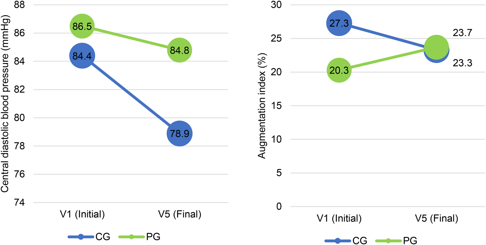 | Augmentation index [AIx(%)] | 23.3 ± 11.0 | 23.8 ± 11.4 | 0.876 | −4.0 ± 12.1 | 3.4 ± 12.1 | 0 . 016 |