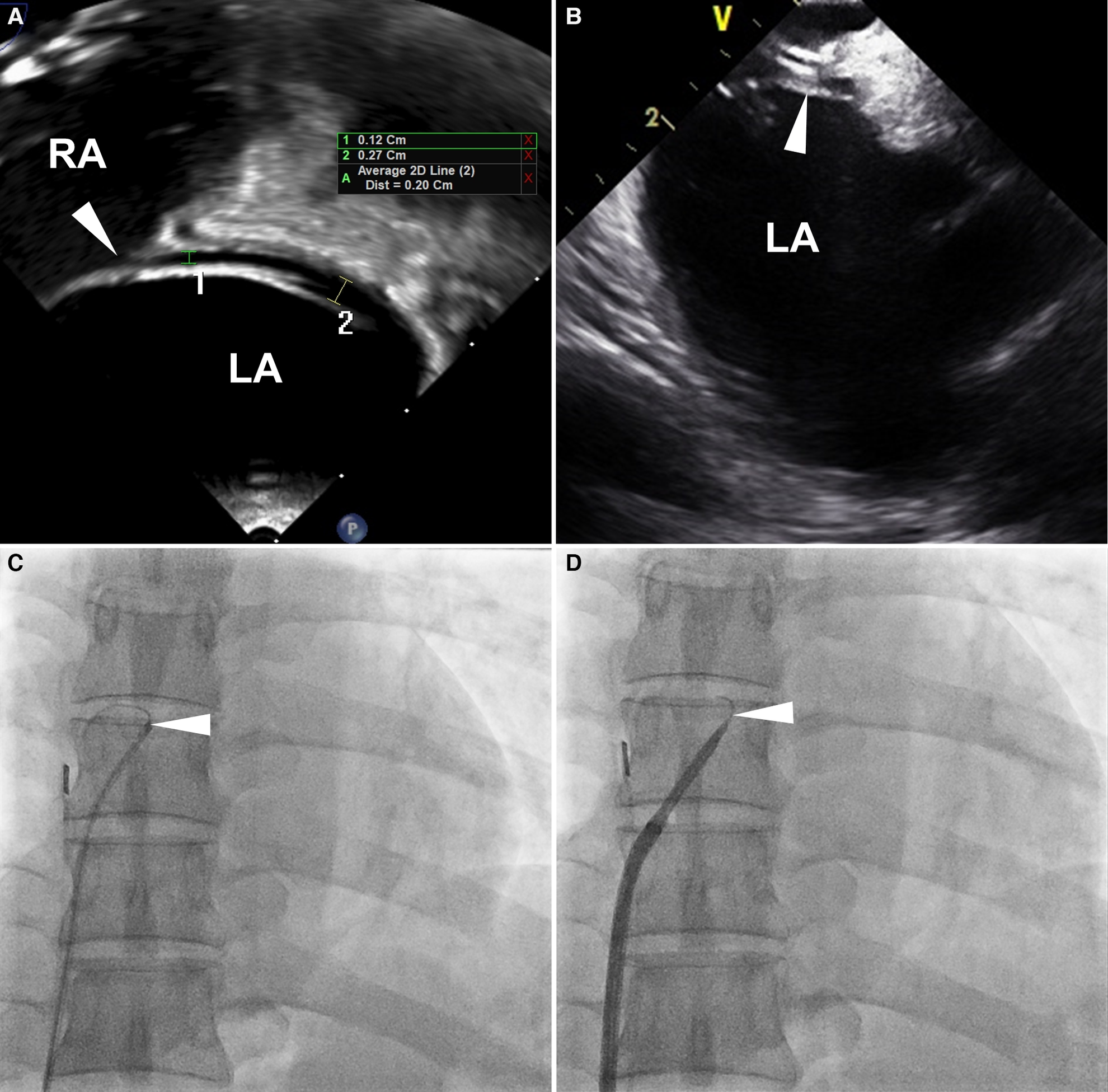 Definition of uncrossable PFO. Images from a 53-year-old man with an uncrossable PFO. (A) TEE 90-degree bicaval view shows a long-tunnel PFO. The probe was additionally rotated to optimize the visibility of the PFO tunnel in the bicaval view. (B) ICE imaging for PFO closure guidance. (C) 6 Fr MP catheter and 0.035-inch guidewire failed to pass through PFO. (D) SL1TM sheath replacement didn't resolve the issue. White arrowheads indicate PFO. ICE, intracardiac echocardiography; LA, left atrium; MP, multipurpose; PFO, patent foramen ovale; RA, right atrium; TEE, transesophageal echocardiography.