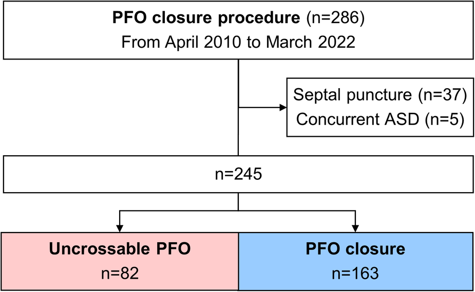 Between April 2010 and March 2022, 286 consecutive patients with CS, in whom PFO closure was attempted, were enrolled. A total of 245 patients were analyzed after excluding 41 patients (37 patients in whom PFO device was implanted using the transseptal puncture technique and 5 patients who had concurrent ASD). Of the 245 patients, 163 (66.5%) underwent successful PFO closure and 82 (33.5%) had uncrossable PFOs (Figure 2). The Amplatzer PFO Occluder (St Jude Medical, St. Paul, MN), GORE® Septal Occluder (WL Gore & Associates, Inc., Newark, DE), and Occlutech Figulla® Flex II (Jena, Germany) were implanted in all patients in the PFO closure group. All unsuccessful procedures were due to uncrossable PFOs.